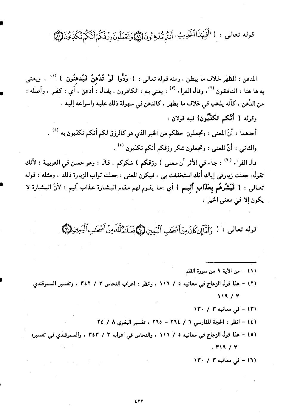قال الفراء: جاء في الأثر أنّ معنى (رزقكم) شكركم، قال: وهو حسن في العربية، لأنك تقول: جعلت زيارتي إياك أنك استخففت بي، فيكون المعنى: جعلت ثواب الزيارة ذلك، ومثله: قوله قعالى: (فَبَشِّرْهُمْ بِعَذَابٍ أَلِيمٍ) أي: ما يقوم لهم مقام البشارة عذاب أليم؛ لأنَّ البشارة لا تكون إلا في معنى الخير.