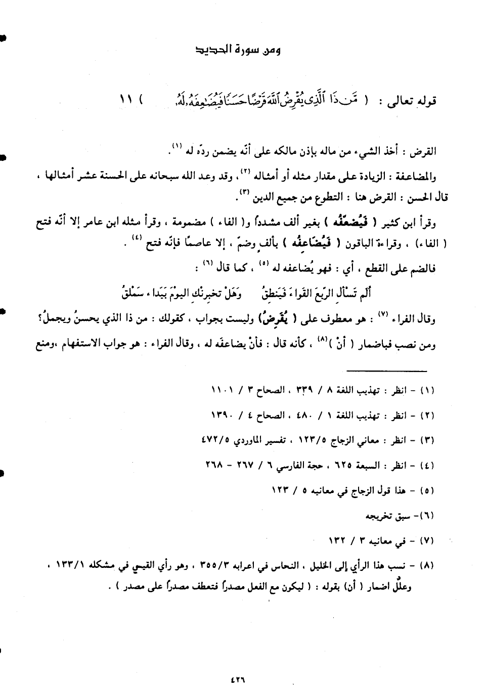 وقال الفراء: هو معطوف على (يُقْرِضُ) وليست بجواب. كقولك: من ذا الذي يحسن ويجملُ؟