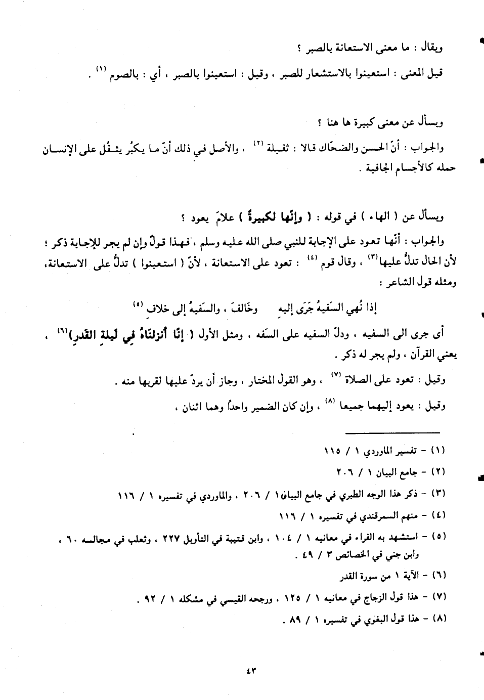 والجواب: أنّها تعود على الإجابة للنبي صلى الله عليه وسلم، فهذا قول وإن لم يجر للإجابة ذكر؛ لأنّ الحال تدلُّ عليها، وقال قوم: تعود على الاستعانة. لأنّ (استعينوا) تدلُّ على الاستعانة، ومثله قول الشاعر: