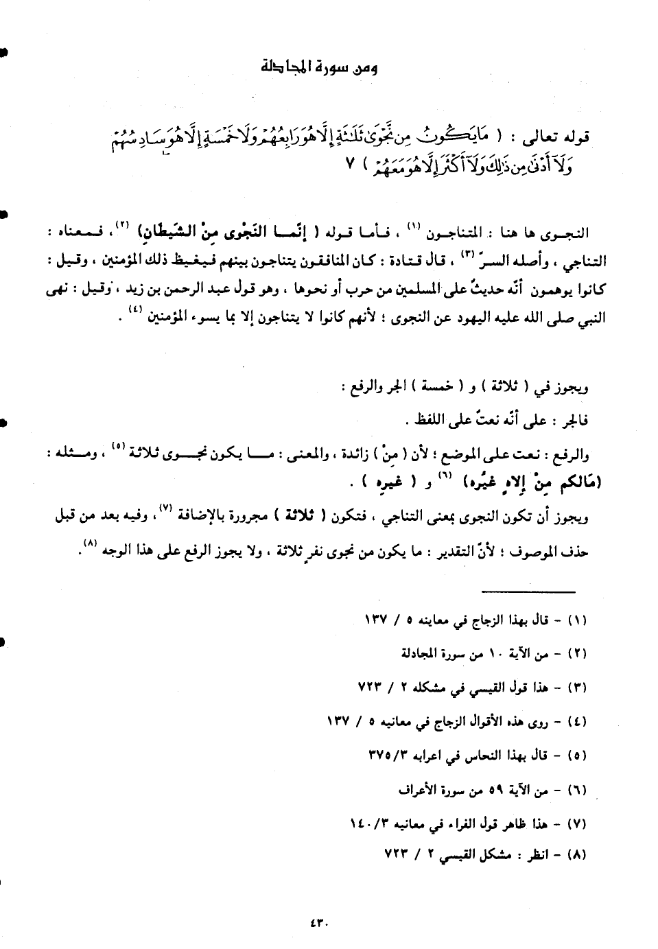 ويجوز أن تكون النجوى بمعنى التناجي، فتكون (ثلاثة) مجرورة بالإضافة. وفيه بعد من قبل حذف الموصوف؛ لأنّ التقدير: ما يكون من نجوى نفرٍ ثلاثة. ولا يجوز الرفع على هذا الوجه.
