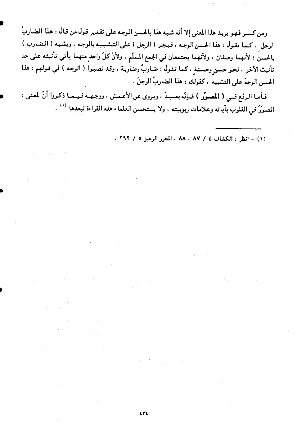 ومن كسر فهو يريد هذا المعنى إلا أنّه شبه هذا بالحسن الوجه على تقدير قول من قال: هذا الضاربُ الرجلِ، كما تقول: هذا الحسن الوجه، فيجر (الرجل) على التشبيه بالوجه. ويشبه (الضارب) بالحسن؛ لأنَّهما وصفان، ولأنهما يجتمعان في الجمع المسلّم، ولأنّ كل واحد منهما يأتي تأنيثه على حد تأنيث الآخر، نحو حسنٍ وحسنةٍ، كما تقول: ضاربٌ وضاربة، وقد نصبوا (الوجه) في قولهم: هذا الحسن الوجهَ على التشبيه، كقولك: هذا الضاربُ الرجلَ.