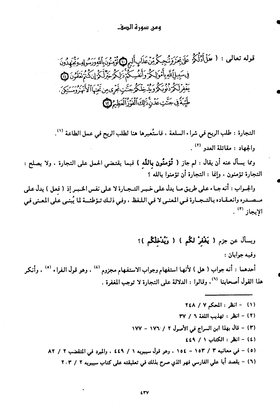 قوله تعالى: (هَلْ أَدُلُّكُمْ عَلَى تِجَارَةٍ تُنْجِيكُمْ مِنْ عَذَابٍ أَلِيمٍ (10) تُؤْمِنُونَ بِاللَّهِ وَرَسُولِهِ وَتُجَاهِدُونَ فِي سَبِيلِ اللَّهِ بِأَمْوَالِكُمْ وَأَنْفُسِكُمْ ذَلِكُمْ خَيْرٌ لَكُمْ إِنْ كُنْتُمْ تَعْلَمُونَ (11) يَغْفِرْ لَكُمْ ذُنُوبَكُمْ وَيُدْخِلْكُمْ جَنَّاتٍ تَجْرِي مِنْ تَحْتِهَا الْأَنْهَارُ وَمَسَاكِنَ طَيِّبَةً فِي جَنَّاتِ عَدْنٍ ذَلِكَ الْفَوْزُ الْعَظِيمُ (12))
