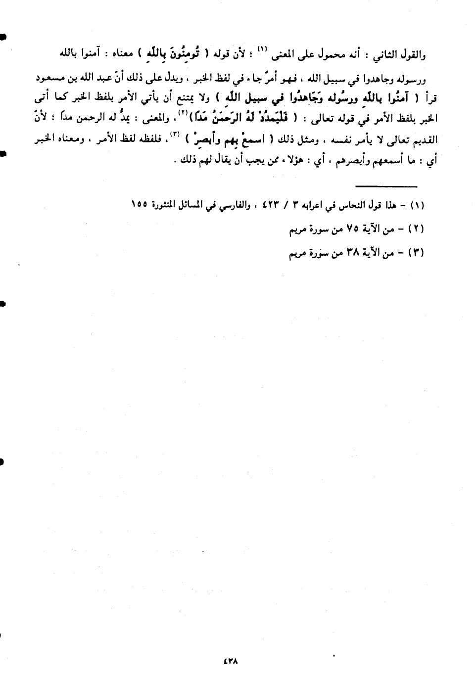 والقول الثاني: أنّه محمول على المعنى؛ لأنَّ قوله (تُؤْمِنُونَ بِاللَّهِ) معناه: آمنوا بالله ورسوله وجاهدوا في سبيل الله، فهو أمرٌ جاء في لفظ الخبر، ويدل على ذلك أنّ عبد الله بن مسعود قرأ (آمنُوا باللهِ ورسُوله وَجَاهدُوا في سبيل اللهِ) ولا يمتنع أن يأتي الأمر بلفظ الخبر كما أتى الخبر بلفظ الأمر في قوله تعالى: (فَلْيَمْدُدْ لَهُ الرَّحْمَنُ مَدًّا). والمعنى: يمدُّ له الرَّحْمَنُ مَدًّا؛ لأنَّ القديم تعالى لا يأمر نفسه، ومثل ذلك (أَسْمِعْ بِهِمْ وَأَبْصِرْ)، فلفظه لفظ الأمر، ومعناه الخبر أي: ما أسمعهم وأبصرهم. أي: هَؤُلَاءِ ممن يجب أن يقال لهم ذلك.