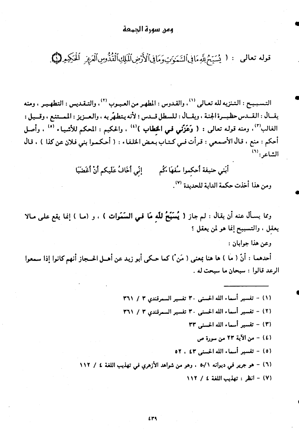 قوله تعالى: (يُسَبِّحُ لِلَّهِ مَا فِي السَّمَاوَاتِ وَمَا فِي الْأَرْضِ الْمَلِكِ الْقُدُّوسِ الْعَزِيزِ الْحَكِيمِ (1))