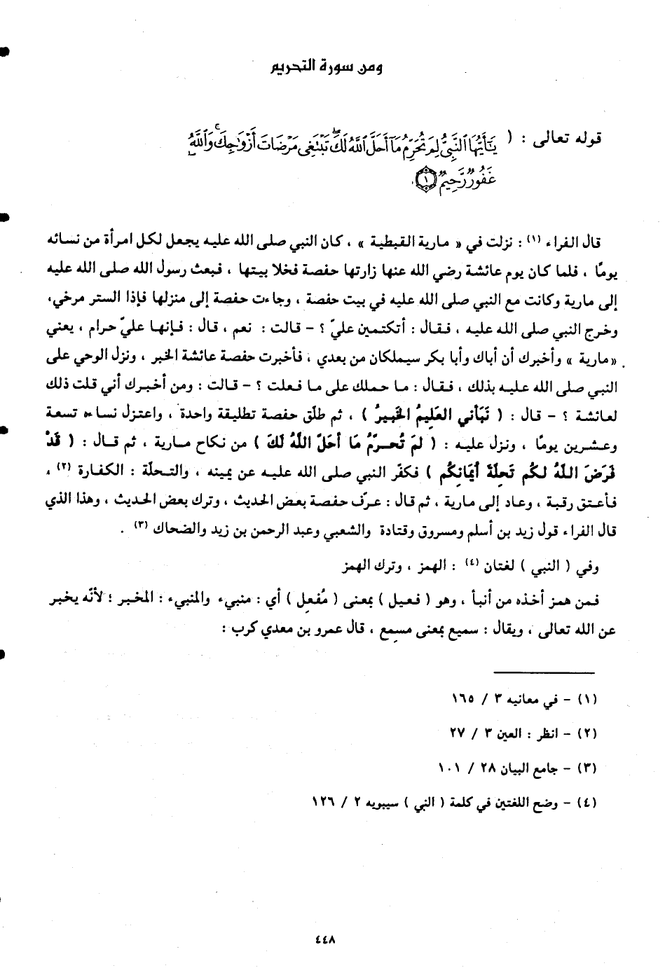 قال الفراء: نزلت فى لا مارية القبطية، كان النبي صلى الله عليه يجعل لكل امرأة من نسائه يوماً، فلما كان يوم عائشة رضي الله عنها زارتها حفصة فخلا بيتها، فبعث رسول الله صلى الله عليه إلى مارية وكانت مع النبي صلى الله عليه في بيت حفصة، وجاءت حفصة إلى منزلها فإذا الستر مرخي، وخرج النبي صلى الله عليه وسلم، فقال: أتكتمين عليَّ؟ - قالت: نعم، قال: فإنها عليَّ حرام، يعني " مارية " وأخبرك أنّ أباك وأبا بكر سيملكان من بعدي، فأخبرت حفصة عائشة الخبر، ونزل الوحي على النبي صلى الله عليه بذلك، فقال: ما حملك على ما فعلت؟ - قالت: ومن أخبرك أني قلت ذلك لعائشة؟ - قال: (نَبَّأَنِيَ الْعَلِيمُ الْخَبِيرُ)، ثم طلق حفصة تطليقة واحدة، واعتزل نساءه تسعة وعشرين يومًا، ونزل عليه: (لِمَ تُحَرِّمُ مَا أَحَلَّ اللَّهُ لَكَ) من نكاح مارية، ثم قال: (قَدْ فَرَضَ اللَّهُ لَكُمْ تَحِلَّةَ أَيْمَانِكُمْ) فكفَّر النبي صلى الله عليه عن يمينه، والتحلة: الكفارة، فأعتق رقبة، وعاد إلى مارية، ثم قال: عرَّف حفصة بعض الحديث، وترك بعض الحديث، وهذا الذي قال الفراء قول زيد بن أسلم ومسروق وقتادة والشعبي وعبد الرحمن بن زيد والضحاك.