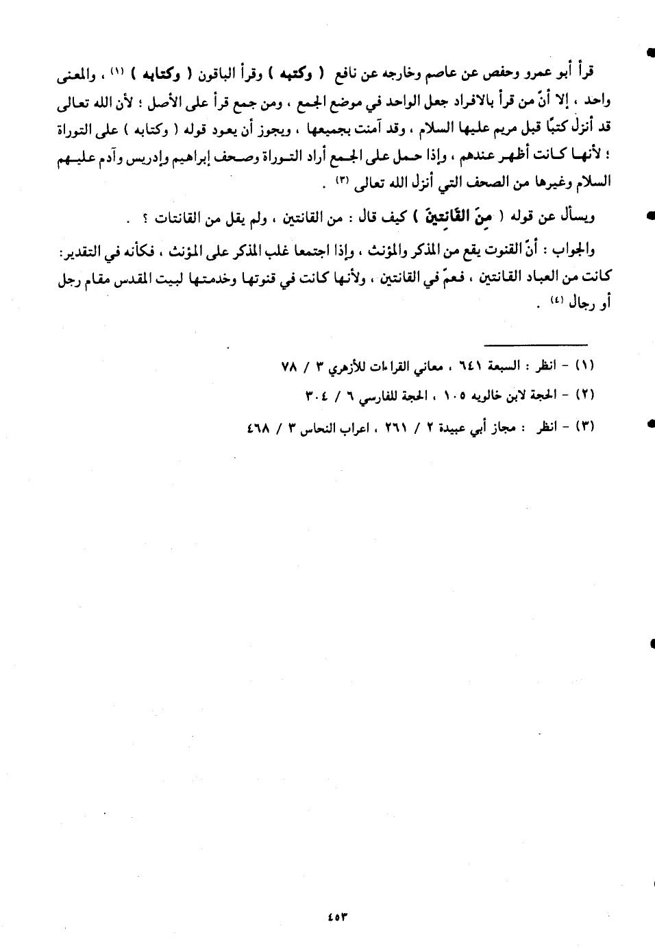 قرأ أبو عمرو وحفص عن عاصم وخارجه عن نافع (وكتبه) وقرأ الباقون (وكتابه)، والمعنى واحد، إلا أنّ من قرأ بالإفراد جعل الواحد في موضع الجمع، ومن جمع قرأ على الأصل؛ لأنَّ الله تعالى قد أنزل كتبًا قبل مريم عليها السلام، وقد آمنت بجميعها، ويجوز أن يعود قوله (وكتابه) على التوراة؛ لأنها كانت أظهر عندهم، وإذا حمل على الجمع أراد التوراة وصحف إبراهيم وإدريس وآدم عليهم السلام وغيرها من الصحف التي أنزل الله تعالى.