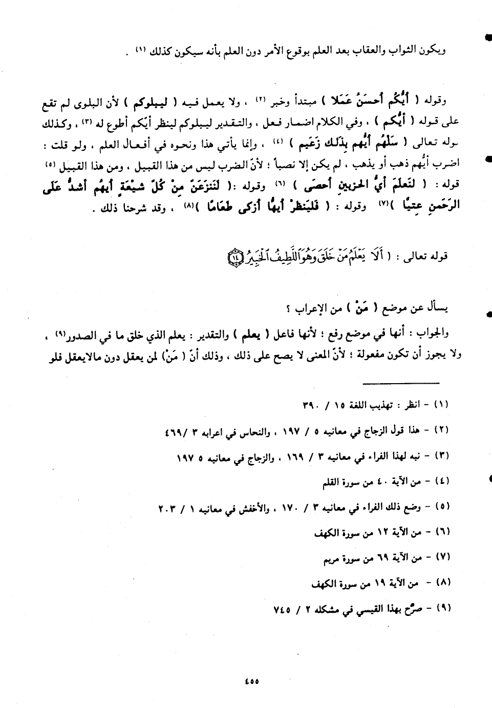 وقوله (أَيُّكُمْ أَحْسَنُ عَمَلًا) مبتدأ وخبر، ولا يعمل فيه (ليبلوكم) لأنّ البلوى لم تقع على قوله (أَيُّكُمْ)، وفي الكلام إضمار فعل، والتقدير ليبلوكم لينظر (أَيُّكُمْ) أطوع له، وكذلك قوله تعالى (سَلْهُمْ أَيُّهُمْ بِذَلِكَ زَعِيمٌ)، وإنما يأتي هذا ونحوه في أفعال العلم، ولو قلت: اضرب أيُهم ذهب أو يذهب، لم يكن إلا نصباً؛ لأنّ الضرب ليس من هذا القبيل، ومن هذا القبيل قوله: (لِنَعْلَمَ أَيُّ الْحِزْبَيْنِ أَحْصَى) وقوله: (لَنَنْزِعَنَّ مِنْ كُلِّ شِيعَةٍ أَيُّهُمْ أَشَدُّ عَلَى الرَّحْمَنِ عِتِيًّا) وقوله: (فَلْيَنْظُرْ أَيُّهَا أَزْكَى طَعَامًا)، وقد شرحنا ذلك.