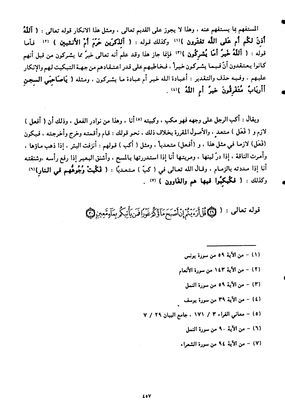 المستفهم بما يستفهم عنه، وهذا لا يجوز على القديم تعالى، ومثل هذا الإنكار قوله تعالى: (آللَّهُ أَذِنَ لَكُمْ أَمْ عَلَى اللَّهِ تَفْتَرُونَ) وكذلك قوله: (آلذَّكَرَيْنِ حَرَّمَ أَمِ الْأُنْثَيَيْنِ) فأما قوله: (آللَّهُ خَيْرٌ أَمَّا يُشْرِكُونَ) فإنما جاز هذا وقد علم أنّه تعالى خير مما يشركون من قبل أنّهم كانوا يعتقدون أنَّ فيما يشركون خيراً، فخاطبهم على قدر اعتقادهم من جهة التبكيت لهم والإنكار عليهم، وفيه حذف والتقدير: أعبادة الله خير أم عبادة ما يشركون، ومثله (يَا صَاحِبَيِ السِّجْنِ أَأَرْبَابٌ مُتَفَرِّقُونَ خَيْرٌ أَمِ اللَّهُ).