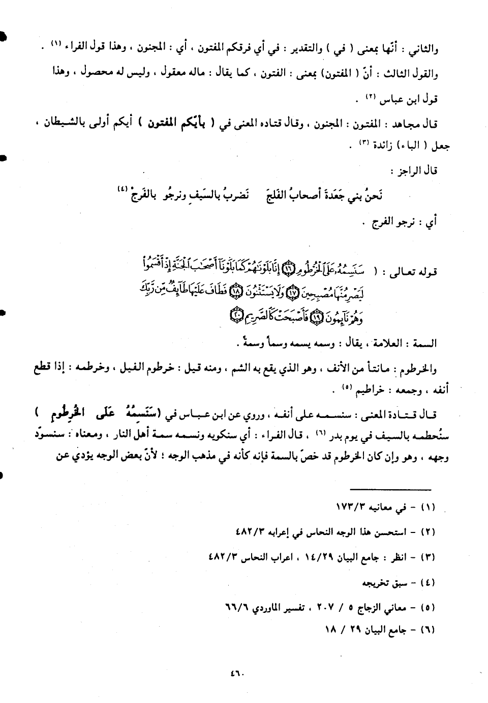 قال مجاهد: المفتون: المجنون. وقال قتادة المعنى في (بِأَيِّكُمُ الْمَفْتُونُ) أيكم أولى بالشيطان، جعل (الباء) زائدة.