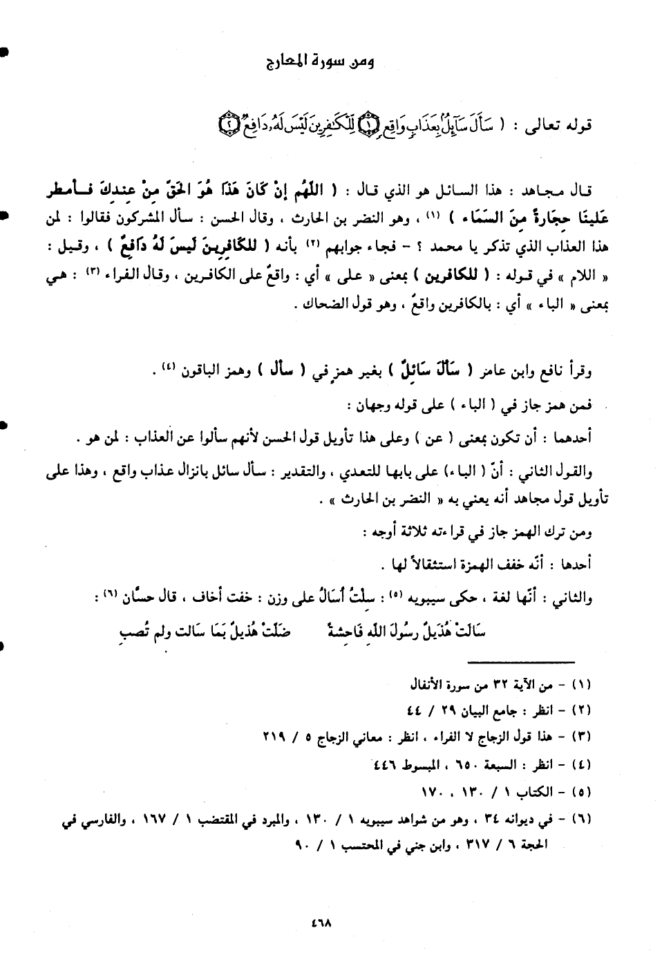والقول الثاني: أنّ (الباء) على بابها للتعدي، والتقدير: سأل سائل بإنزال عذاب واقع، وهذا على تأويل قول مجاهد أنّه يعني به " النضر بن الحارث ".