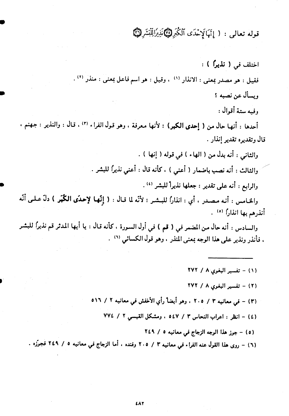 والخامس: أنّه مصدر، أي: إنذارًا للبشر؛ لأنّه لما قال: (إِنَّهَا لَإِحْدَى الْكُبَرِ) دلّ على أنّه أنذرهم بها إنذارًا.