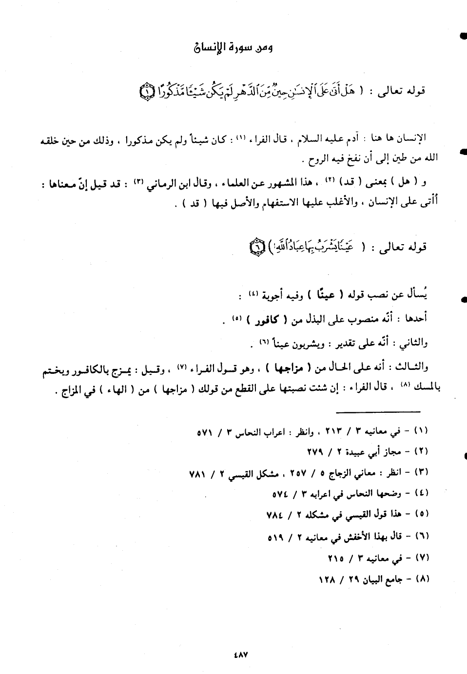 والثالث: أنّه على الحال من (مزاجها)، وهو قول الفراء. وقيل: يمزج بالكافور ويختم بالمسك، قال الفراء: إن شئت نصبتها على القطع من قولك (مزاجها) من (الهاء) في المزاج.