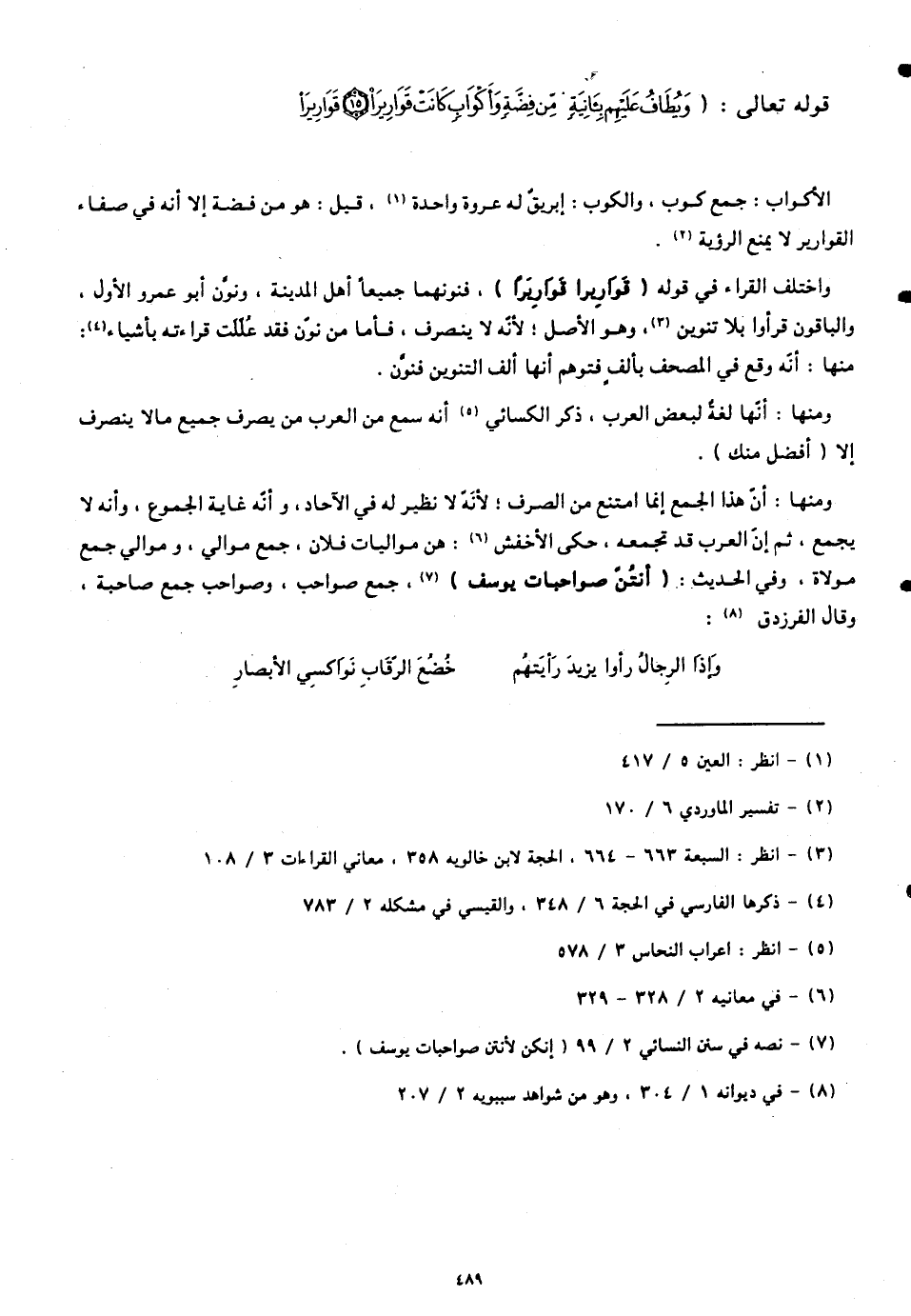 ومنها: أنّ هذا الجمع إنما امتنع من الصرف؛ لأنّه لا نظير له في الآحاد، وأنّه غاية الجموع. وأنه لا يجمع، ثم إنّ العرب قد تجمعه، حكى الأخفش: هن مواليات فلان، جمع موالي، وموالي جمع مولاة. وفي الحديث -: (أنتُنّ صواحبات يوسف)، جمع صواحب، وصواحب جمع صاحبة، وقال الفرزدق: