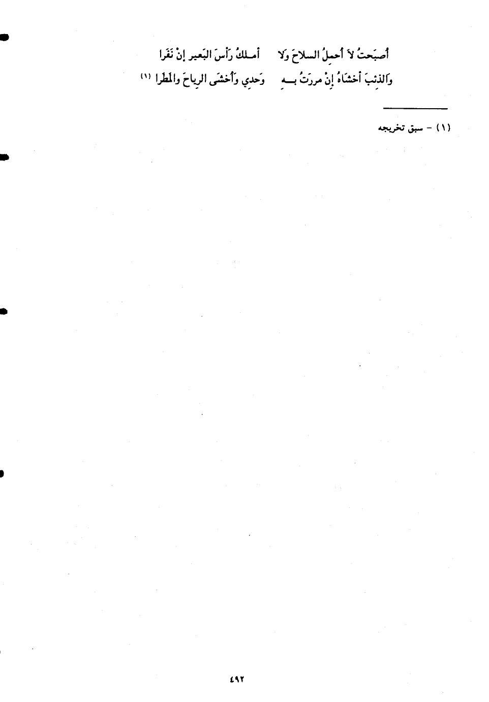 أَصْبَحْتُ لَا أَحْمِلُ السلاحَ وَلَا ... أَملكُ رَأْسَ البعيرِ إِن نَفَرا