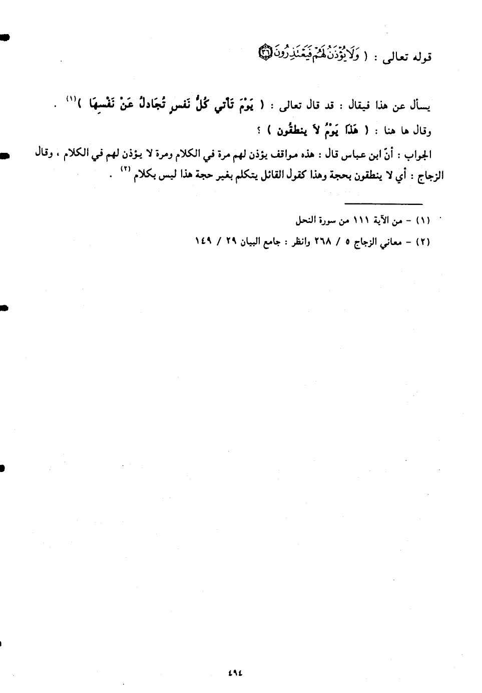 الجواب: أنّ ابن عباس قال: هذه مواقف يؤذن لهم مرة في الكلام ومرة لا يؤذن لهم في الكلام، وقال الزجاج: أي لا ينطقون بحجة وهذا كقول القائل يتكلم بغير حجة هذا ليس بكلام.