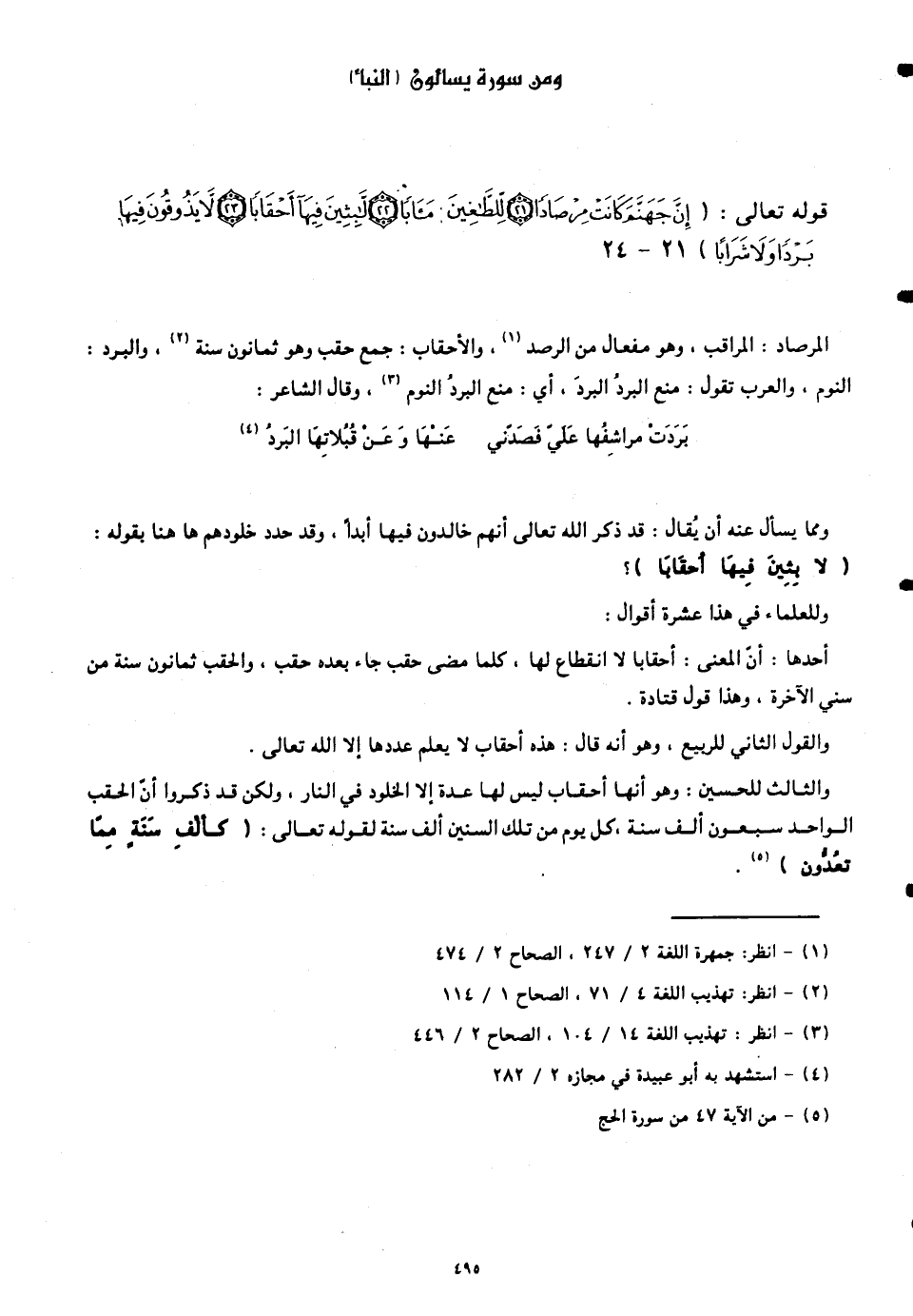 المرصاد: المراقب، وهو مفعال من الرصد، والأحقاب: جمع حقب وهو ثمانون سنة، والبرد: النوم، والعرب تقول: منع البردُ البردَ، أي: منع البردُ النوم، وقال الشاعر: