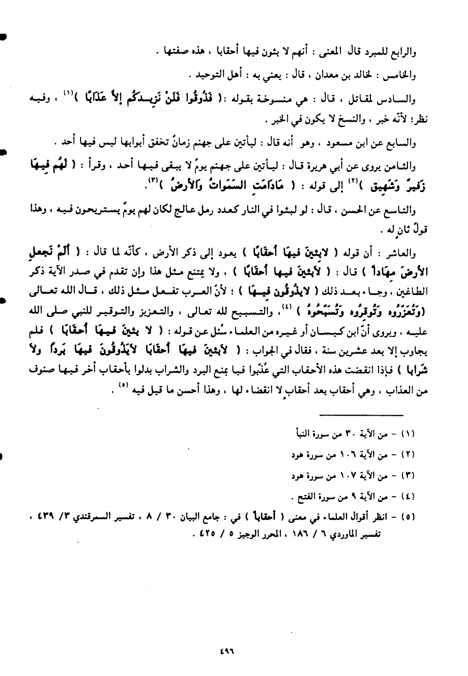 والرابع للمبرد قال المعنى: أنّهم لابثون فيها أحقاباً، هذه صفتها.