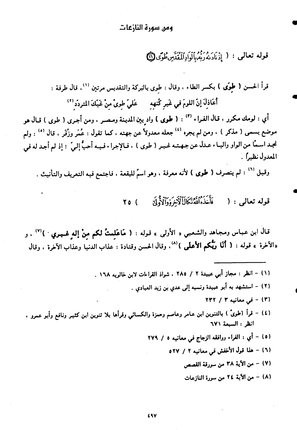 أي: لومك مكرر، قال الفراء: (طوى) وادٍ بين المدينة ومصر، ومن أجرى (طوى) قال هو موضع يسمى (مذكر)، ومن لم يجره جعله معدولًا عن جهته، كما تقول: عُمر وزُفَر، قال: ولم نجد اسمًا من الواو والياء عدل عن جهته غير (طوى)، فالإجراء فيه أحب إليَّ؛ إذ لم أجد له في المعدول نظيرًا.