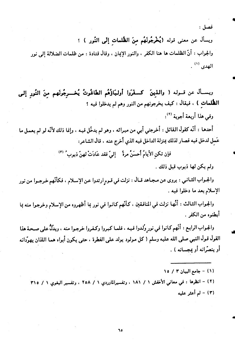 والجواب الرابع: أنّهم كانوا في نورٍ وُلدوا فيه. فلما كبروا وكفروا خرجوا منه، ويدُلُّ على صحة هذا القول قول النبي صلى الله عليه وسلم (كل مولود يولد على الفطرة، حتى يكون أبواه هما اللذان يهوّدانه أو ينصّرانه أو يمجسانه).