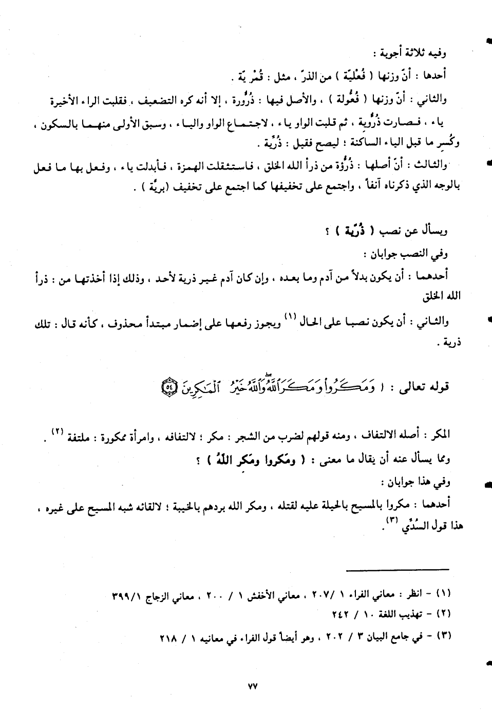 ْوالثالث: أنّ أصلها: ذُرُّؤة من ذرأ الله الخلق. فاستثقلت الهمزة. فأبدلت ياء. وفعل بها ما فعل بالوجه الذي ذكرناه آنفاً، واجتمع على تخفيفها كما اجتمع على تخفيف (بريَّة).