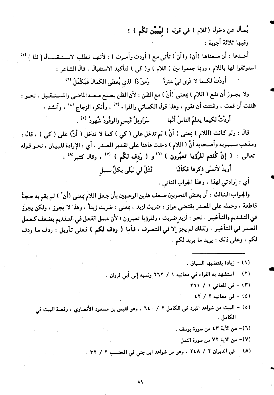 قال: ولو كانت (اللام) بمعنى (أنْ) لم تدخل على (كي) كما لا تدخل (أنْ) على (كي)، قال: ومذهب سيبويه وأصحابه أنّ (اللام) دخلت هاهنا على تقدير المصدر، أي: الإرادة للبيان. نحو قوله تعالى: (إِنْ كُنْتُمْ لِلرُّؤْيَا تَعْبُرُونَ) و (رَدِفَ لَكُمْ)، وقال كثير: