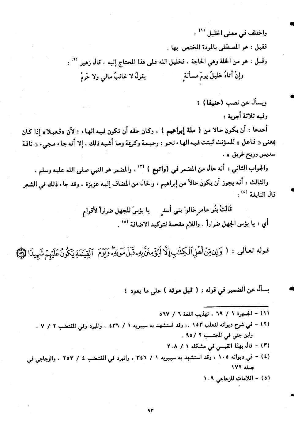 أحدها: أنّ يكون حالا من (ملة إيراهيم)، وكان حقه أنّ تكون فيه الهاء؛ لأنَّ " فعيلا " إذا كان بمعنى " فاعل " للمؤنث ثبتت فيه الهاء نحو: رحيمة وكريمة وما أشبه ذلك، إلا أنّه جاء مجيء " ناقة سديس وريح خريق ".