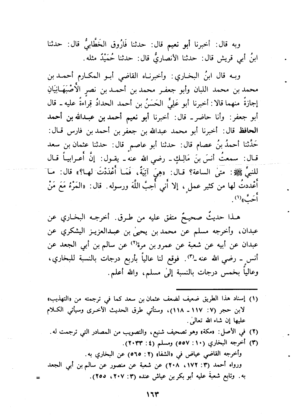 وَبِهِ قَالَ ابْنُ الْبُخَارِيِّ وَأَخْبَرَنَاهُ الْقَاضِي أَبُو الْمَكَارِمِ أَحْمَدُ بْنُ مُحَمَّدِ بْنِ مُحَمَّدٍ اللَّبَّانُ وَأَبُو جَعْفَرٍ مُحَمَّدُ بْنُ أَحْمَدَ بن نصر الاصبهانيان إِجَازَةً مِنْهُمَا قَالَا أَخْبَرَنَا أَبُو عَلِيٍّ الْحَسَنُ بْنُ أَحْمَدَ الْحَدَّادُ قِرَاءَةً عَلَيْهِ قَالَ أَبُو جَعْفَرٍ وَأَنَا حَاضِرٌ قَالَ أَخْبَرَنَا أَبُو نُعَيْمٍ أَحْمَدُ بْنُ عَبْدِ اللَّهِ بْنِ أَحْمَدَ الْحَافِظُ قَالَ أَخْبَرَنَا أَبُو مُحَمَّدٍ عَبْدُ اللَّهِ بْنُ جَعْفَرِ بْنِ أَحْمَدَ بْنِ فَارِسٍ قَالَ حَدَّثَنَا أَحْمَدُ بْنُ عِصَامٍ قَالَ حَدَّثَنَا أَبُو عَاصِمٍ قَالَ حَدَّثَنَا عُثْمَانُ بْنُ سَعْدٍ قَالَ سَمِعْتُ أَنَسَ بْنَ مَالِكٍ رَضِيَ اللَّهُ عَنْهُ يَقُولُ إِنَّ أَعْرَابِيًّا قَالَ لِلنَّبِيِّ صَلَّى اللَّهُ عَلَيْهِ وَسَلَّمَ مَتَى السَّاعَةُ قَالَ هِيَ آتِيَةٌ فَمَا أَعْدَدْتَ لَهَا قَالَ مَا أَعْدَدْتُ لَهَا مِنْ كَثِيرِ عَمَلٍ إِلَّا أَنِّي أُحِبُّ اللَّهَ وَرَسُولَهُ قَالَ الْمَرْءُ مَعَ مَنْ أَحَبَّ