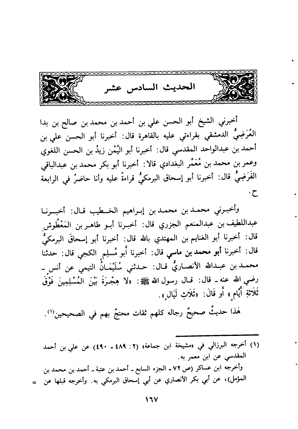 وَأَخْبَرَنِي مُحَمَّدُ بْنُ مُحَمَّدِ بْنِ إِبْرَاهِيمَ الْخَطِيبُ قَالَ أَخْبَرَنَا عبدُ اللَّطِيفِ بْنِ عَبْدِ الْمُنْعِمِ الْجَزَرِيُّ قَالَ أَخْبَرَنَا أَبُو طَاهِرٍ بْنِ الْمَعْطُوشِ قَالَ أَخْبَرَنَا أَبُو الْغَنَايِمِ بْنُ الْمُهْتَدِي بِاللَّهِ قَالَ أَخْبَرَنَا أَبُو إِسْحَاقَ الْبَرْمَكِيُّ قَالَ أَخْبَرَنَا أَبُو مُحَمَّدِ بْنُ مَاسِيٍّ قَالَ أَخْبَرَنَا أَبُو مُسْلِمٍ الْكَجِّيُّ قَالَ حَدَّثَنَا مُحَمَّدُ بْنُ عَبْدِ اللَّهِ الْأَنْصَارِيُّ قَالَ حَدَّثَني سُلَيْمَانُ التَّيْمِيُّ عَنْ أَنَسٍ رَضِيَ اللَّهُ عَنْهُ قَالَ قَالَ رَسُولُ اللَّهِ صَلَّى اللَّهُ عَلَيْهِ وَسَلَّمَ لَا هِجْرَةَ بَيْنَ الْمُسْلِمِينَ فَوْقَ ثَلَاثَةِ أَيَّامٍ أَوْ قَالَ ثَلَاثِ لَيَالٍ