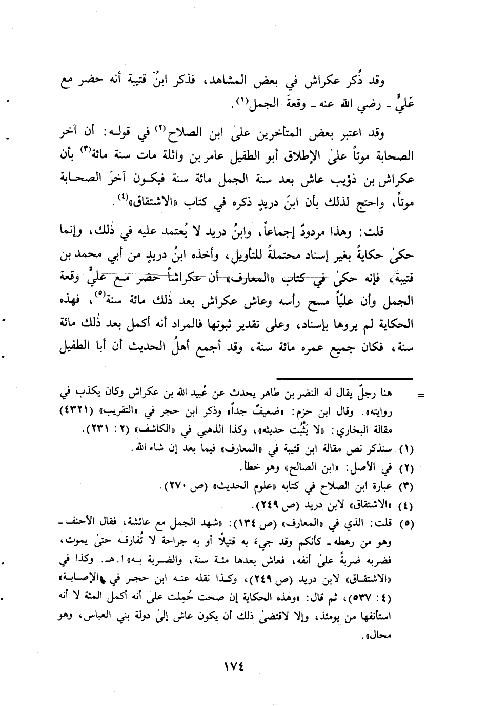 وَقَدِ اعْتَبَرَ بَعْضُ الْمُتَأَخِّرِينَ عَلَى ابْنِ الصَّلَاحِ فِي قَوْلِهِ أَنَّ آخِرَ الصَّحَابَةِ مَوْتًا عَلَى الْإِطْلَاقِ أَبُو الطُّفَيْلِ عامربن وَاثِلَةَ مَاتَ سَنَةَ مِائَةٍ بِأَنَّ عِكْرَاشَ بْنَ ذُؤَيْبٍ عَاشَ بَعْدَ سَنَةِ الْجَمَلِ مِائَةَ سَنَةٍ فَيَكُونُ آخِرُ الصَّحَابَةِ مَوْتًا وَاحْتَجَّ لِذَلِكَ بِأَنَّ ابْنَ دُرَيْدٍ ذَكَرَهُ فِي كتاب الِاشْتِقَاق
