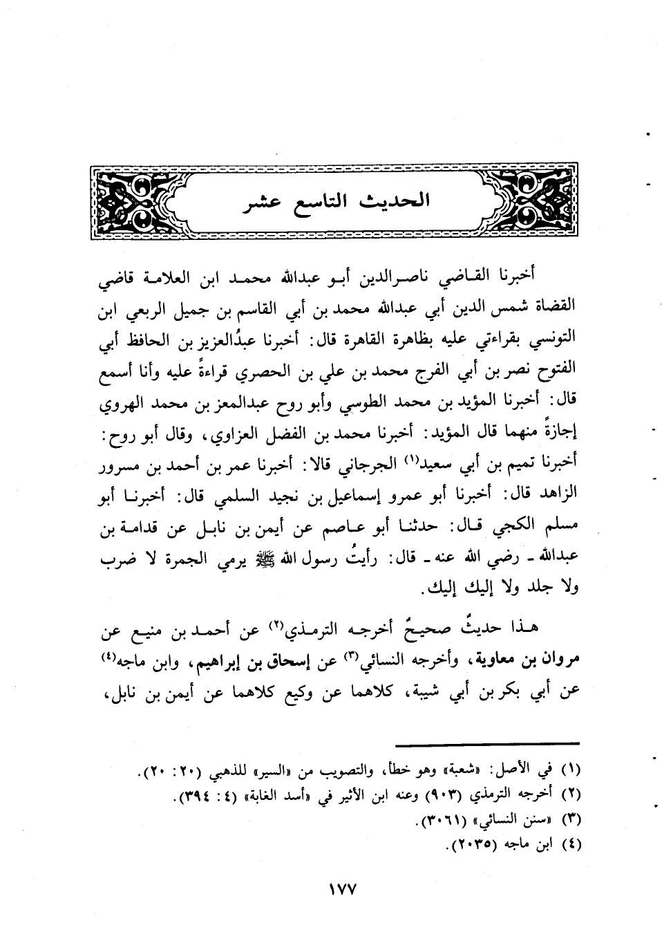 أَخْبَرَنَا الْقَاضِي نَاصِرُ الدِّينِ أَبُو عَبْدِ اللَّهِ مُحَمَّدُ ابْن الْعَلَّامَةِ قَاضِي الْقُضَاةِ شَمْسِ الدِّينِ أَبِي عَبْدِ اللَّهِ مُحَمَّدُ بْنُ أَبِي الْقَاسِمِ بْنِ جَمِيلٍ الرِّبْعِيِّ ابْن التُّونُسِيِّ بِقِرَاءَتِي عَلَيْهِ بِظَاهِرَةِ الْقَاهِرَةِ قَالَ أَخْبَرَنَا عَبْدُ الْعَزِيزِ بْنُ الْحَافِظِ أَبِي الْفُتُوحِ نَصْرُ بْنُ أَبِي الْفَرَجِ مُحَمَّدُ بْنُ عَلِيِّ بْنِ الْحُصْرِيِّ قِرَاءَةً عَلَيْهِ وَأَنَا أَسْمَعُ قَالَ أَخْبَرَنَا الْمُؤَيَّدُ بْنُ مُحَمَّدٍ الطُّوسِيُّ وَأَبُو رَوْحٍ عَبْدُ الْمُعِزِّ بْنُ مُحَمَّدٍ الْهَرَوِيُّ إِجَازَةً مِنْهُمَا قَالَ الْمُؤَيَّدُ أَخْبَرَنَا مُحَمَّدُ بْنُ الْفَضْلِ الْعَزَاوِيُّ وَقَالَ أَبُو رَوْحٍ أَخْبَرَنَا تَمِيمُ بْنُ أَبِي سَعِيدٍ الْجُرْجَانِيُّ قَالَا أَخْبَرَنَا عُمَرُ بْنُ أَحْمَدَ بْنِ مَسْرُورٍ الزَّاهِدُ قَالَ أَخْبَرَنَا أَبُو عَمْرٍو إِسْمَاعِيلُ بْنُ نُجَيْدٍ السُّلَمِيُّ قَالَ أَخْبَرَنَا أَبُو مُسْلِمٍ الْكَجِّيُّ قَالَ حَدَّثَنَا أَبُو عَاصِمٍ عَنْ أَيْمَنَ بْنِ نَابِلٍ عَنْ قُدَامَةَ بْنِ عَبْدِ اللَّهِ رَضِيَ اللَّهُ عَنْهُ قَالَ رَأَيْتُ رَسُولَ اللَّهِ صَلَّى اللَّهُ عَلَيْهِ وَسَلَّمَ يَرْمِي الْجَمْرَةَ لَا ضَرْبَ وَلَا جَلْدَ وَلَا إِلَيْكَ إِلَيْكَ