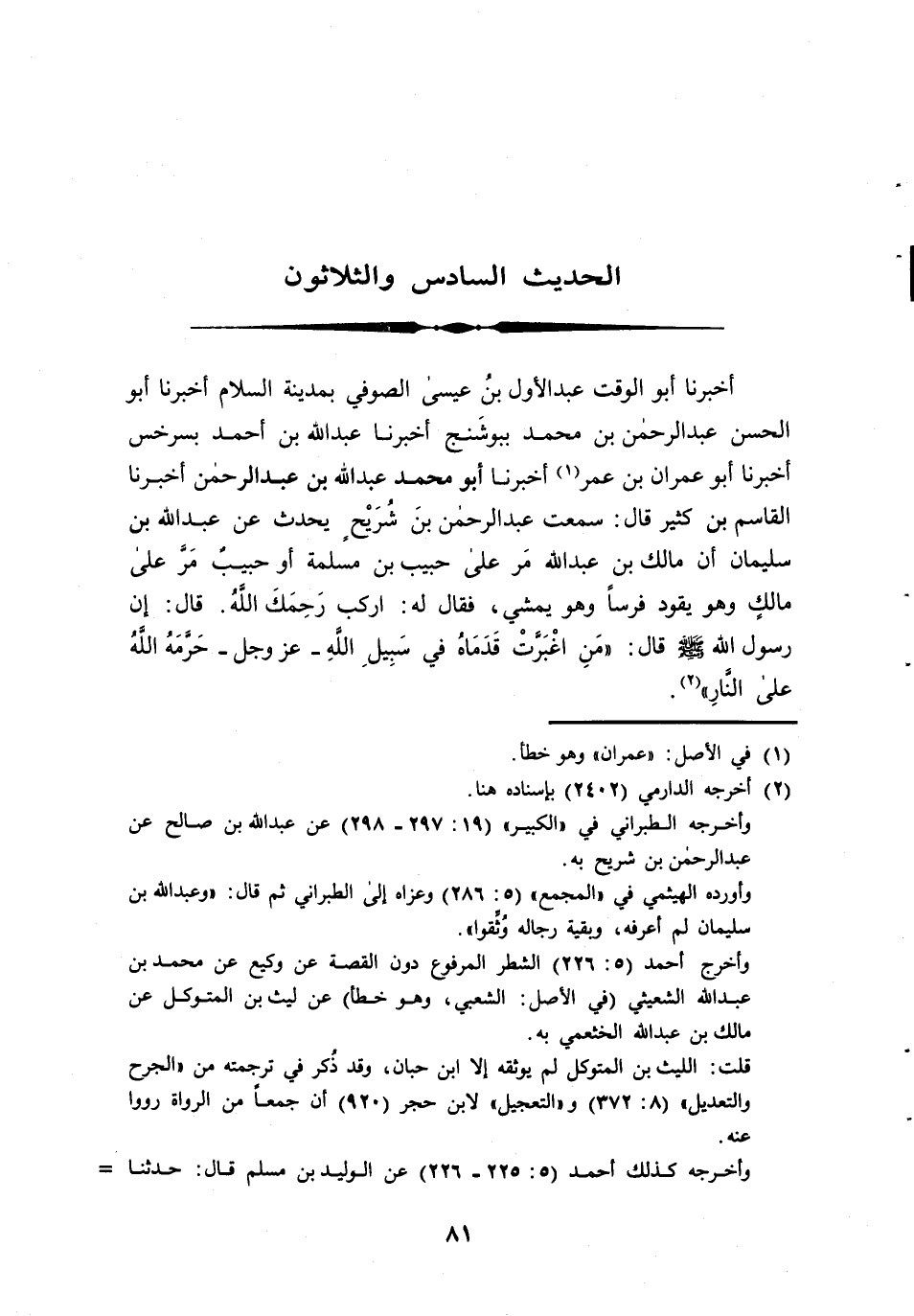 36 - أَخْبَرَنَا أَبُو الْوَقْتِ عَبْدُ الْأَوَّلِ بْنُ عِيسَى الصُّوفِيُّ بِمَدِينَةِ السَّلَامِ، أَخْبَرَنَا أَبُو الْحَسَنِ عَبْدُ الرَّحْمَنِ بْنُ مُحَمَّدٍ بِبُوشَنْجَ، أَخْبَرَنَا عَبْدُ اللَّهِ بْنُ أَحْمَدَ بِسَرْخَسَ، أَخْبَرَنَا أَبُو عِمْرَانَ بْنُ عُمَرَ، أَخْبَرَنَا أَبُو مُحَمَّدٍ عَبْدُ اللَّهِ بْنُ عَبْدِ الرَّحْمَنِ، أَخْبَرَنَا الْقَاسِمُ بْنُ كَثِيرٍ، قَالَ: سَمِعْتُ عَبْدَ الرَّحْمَنِ بْنِ شُرَيْحٍ يُحَدِّثُ، عَنْ عَبْدِ اللَّهِ بْنِ سُلَيْمَانِ أَنَّ مَالِكَ بْنَ عَبْدِ اللَّهِ مَرَّ عَلَى حَبِيبِ بْنِ مَسْلَمَةَ أَوْ حَبِيبًا مَرَّ عَلَى مَالِكٍ وَهُوَ يَقُودُ فَرَسًا وَهُوَ يَمْشِي، فَقَالَ لَهُ: ارْكَبْ رَحِمَكَ اللَّهُ.