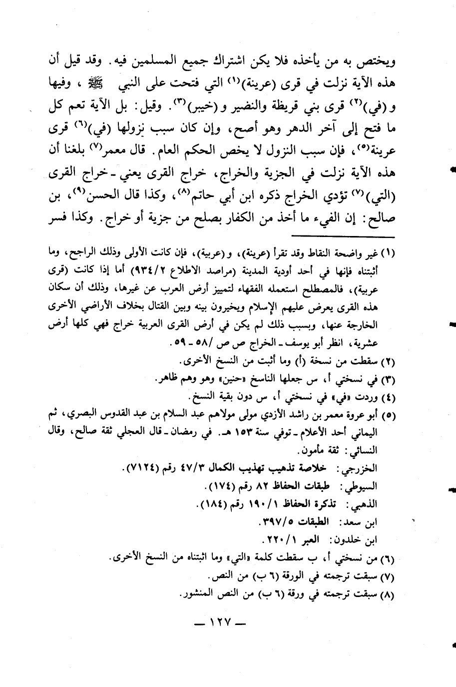 قال: وحدثني عبد السلام بن حرب عن عبد الله بن الوليد المزني عن رجل من بني أسد قال: لم أدرك بالكوفة أعلم بالسواد منه قال: بلغت غلة الصوافي على عهد عمر بن الخطاب رضي الله عنه أربعة آلاف ألف. قلت: وما الصوافي؟ قال: إن عمر أصفى كل أرض كانت لكسرى أو لآل كسرى أو رجل قتل في الحرب أو رجل لحق بأهل الحرب أو مغيض