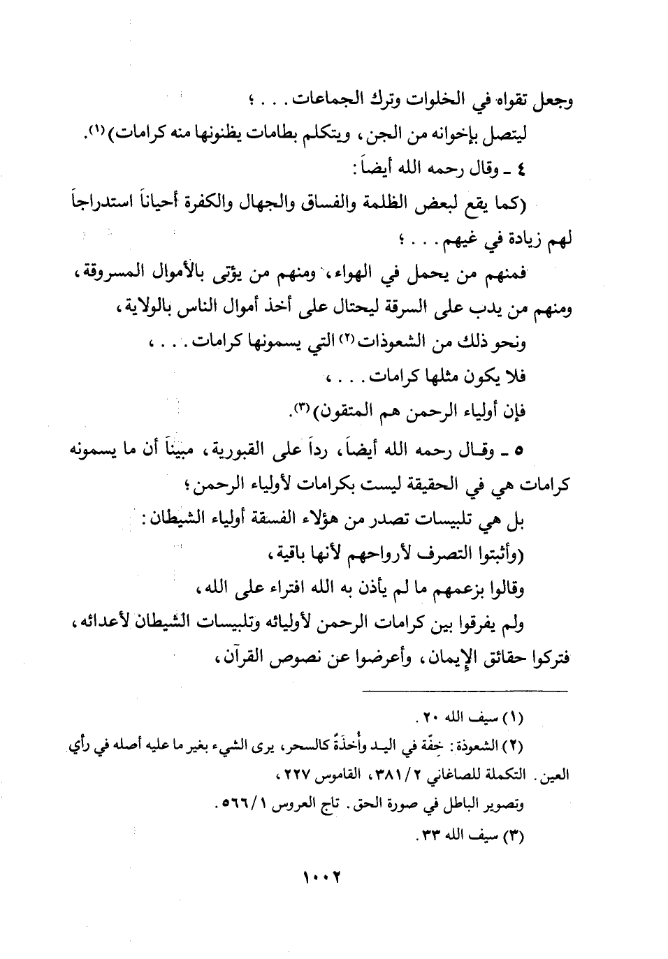 (كما يقع لبعض الظلمة والفساق والجهال والكفرة أحيانا استدراجا لهم زيادة في غيهم ... ؛ فمنهم من يحمل في الهواء، ومنهم من يؤتى بالأموال المسروقة، ومنهم من يدب على السرقة ليحتال على أخذ أموال الناس بالولاية، ونحو ذلك من الشعوذات التي يسمونها كرامات ... ، فلا يكون مثلها كرامات ... ، فإن أولياء الرحمن هم المتقون) .