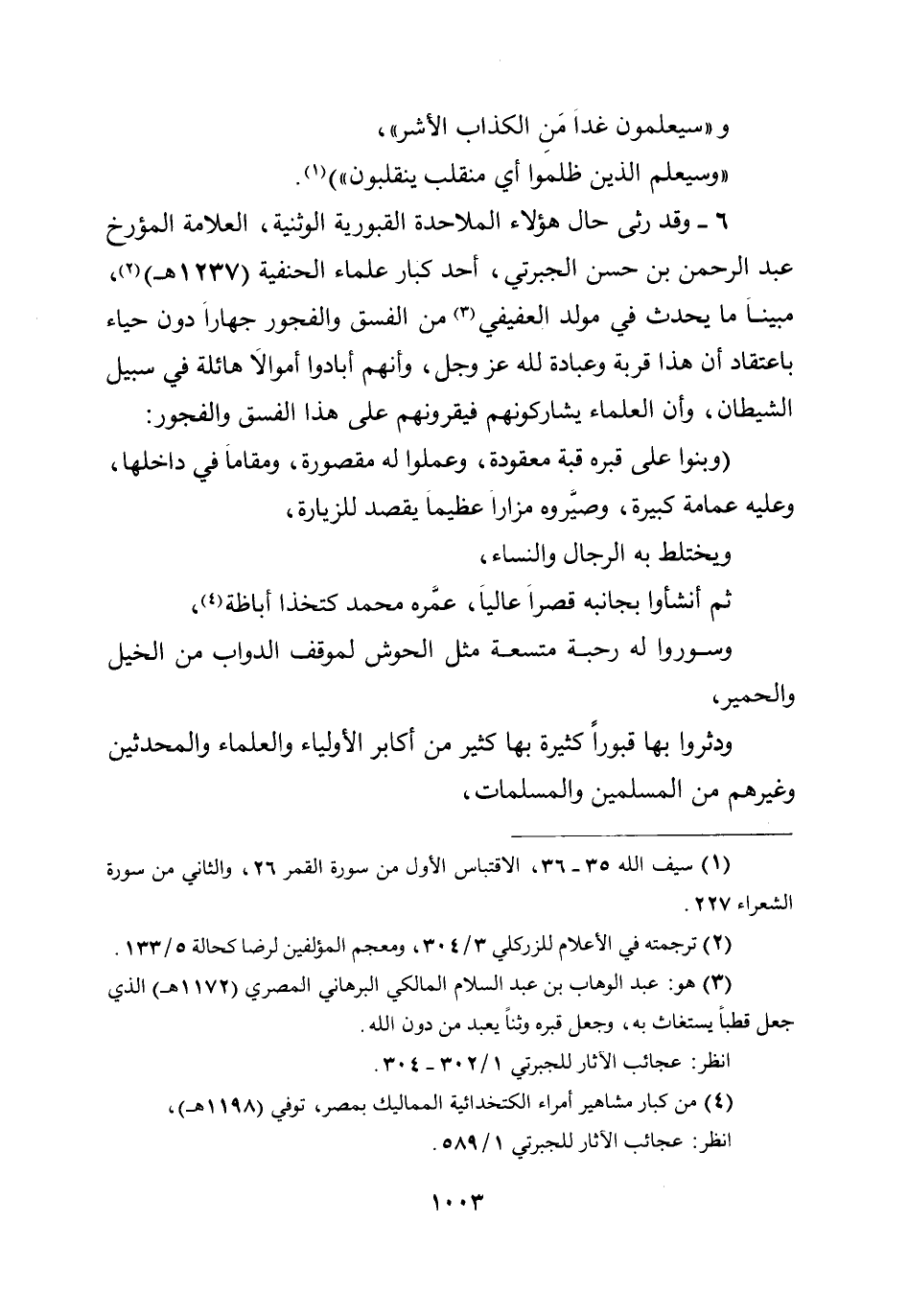 6 - وقد رثى حال هؤلاء الملاحدة القبورية الوثنية، العلامة المؤرخ عبد الرحمن بن حسن الجبرتي، أحد كبار علماء الحنفية (1237هـ) ، مبينا ما يحدث في مولد العفيفي من الفسق والفجور جهارا دون حياء باعتقاد أن هذا قربة وعبادة لله عز وجل، وأنهم أبادوا أموالا هائلة في سبيل الشيطان، وأن العلماء يشاركونهم فيقرونهم على هذا الفسق والفجور: