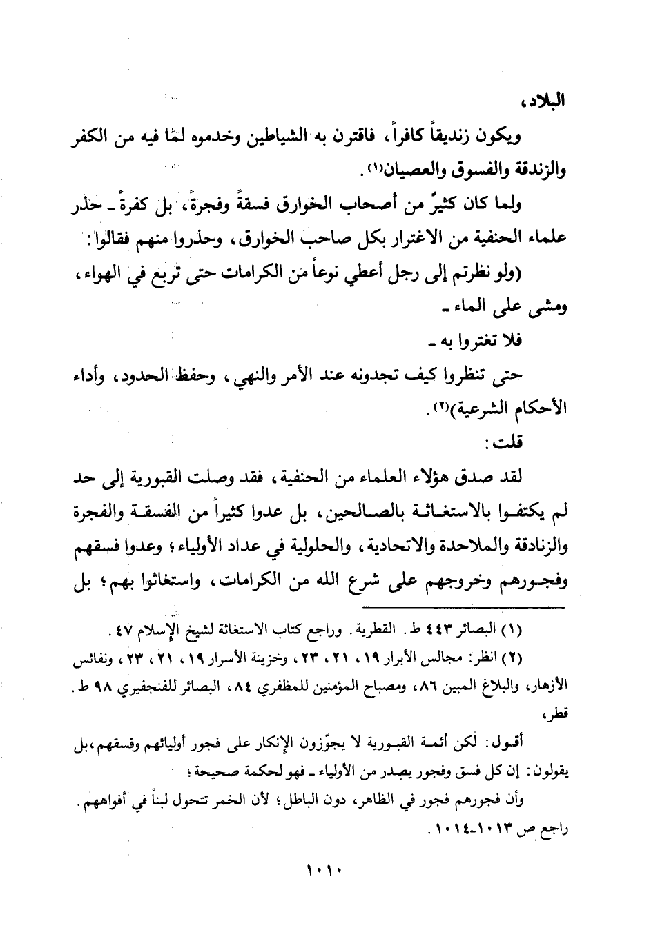 قلت: لقد صدق هؤلاء العلماء من الحنفية، فقد وصلت القبورية إلى حد لم يكتفوا بالاستغاثة بالصالحين، بل عدوا كثيرا من الفسقة والفجرة والزنادقة والملاحدة والاتحادية، والحلولية في عداد الأولياء؛ وعدوا فسقهم وفجورهم وخروجهم على شرع الله من الكرامات، واستغاثوا بهم؛ بل