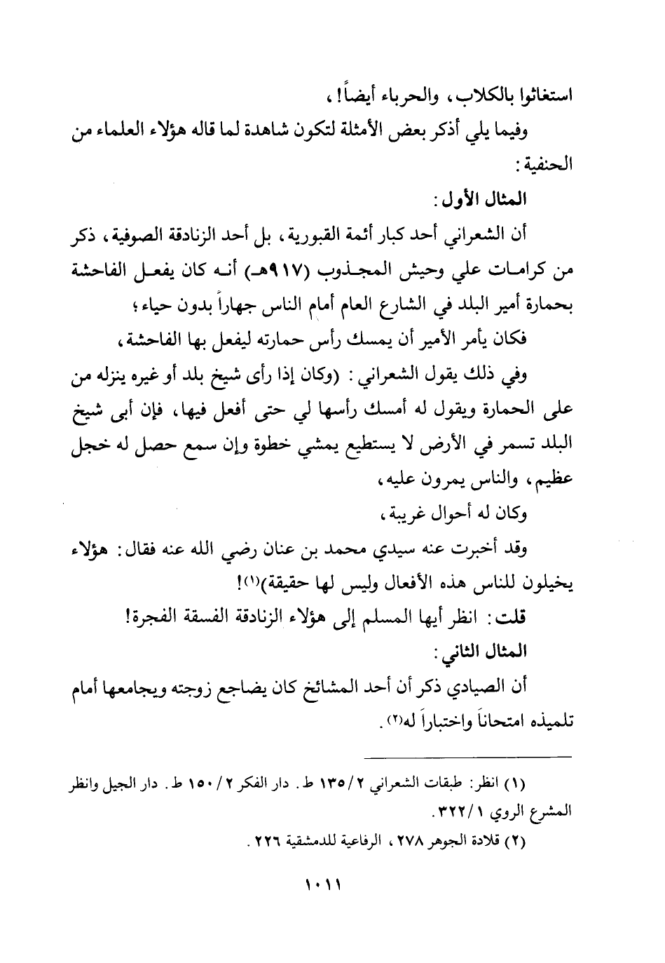 أن الشعراني أحد كبار أئمة القبورية، بل أحد الزنادقة الصوفية، ذكر من كرامات علي وحيش المجذوب (917هـ) أنه كان يفعل الفاحشة بحمارة أمير البلد في الشارع العام أمام الناس جهارا بدون حياء؛ فكان يأمر الأمير أن يمسك رأس حمارته ليفعل بها الفاحشة، وفي ذلك يقول الشعراني: (وكان إذا رأى شيخ بلد أو غيره ينزله من على الحمارة ويقول له أمسك رأسها لي حتى أفعل فيها، فإن أبى شيخ البلد تسمر في الأرض لا يستطيع يمشي خطوة وإن سمع حصل له خجل عظيم، والناس يمرون عليه، وكان له أحوال غريبة، وقد أخبرت عنه سيدي محمد بن عنان رضي الله عنه فقال: هؤلاء يخيلون للناس هذه الأفعال وليس لها حقيقة) ! قلت: انظر أيها المسلم إلى هؤلاء الزنادقة الفسقة الفجرة!
