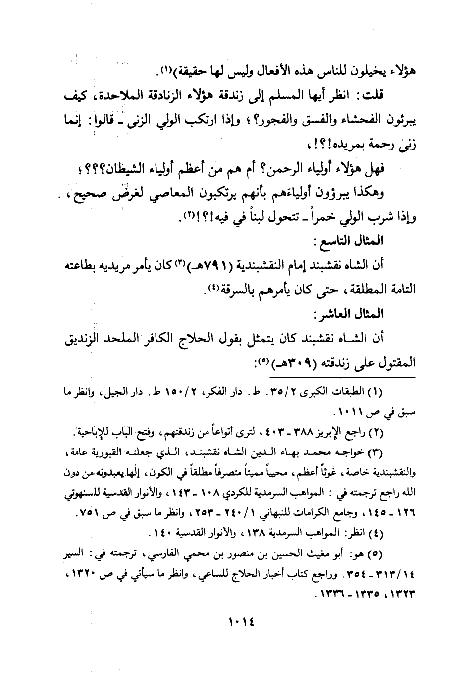 قلت: انظر أيها المسلم إلى زندقة هؤلاء الزنادقة الملاحدة، كيف يبرئون الفحشاء والفسق والفجور؟؛ وإذا ارتكب الولي الزنى - قالوا: إنما زنى رحمة بمريده!؟!، فهل هؤلاء أولياء الرحمن؟ أم هم من أعظم أولياء الشيطان؟؟؟؛ وهكذا يبرؤون أولياءَهم بأنهم يرتكبون المعاصي لغرض صحيح، وإذا شرب الولي خمرا- تتحول لبنا في فيه!؟!.