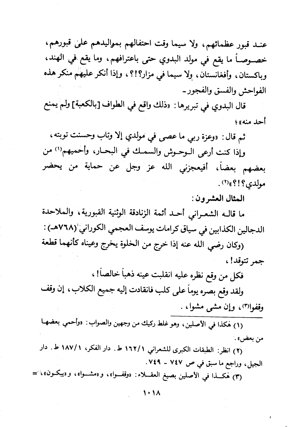 عند قبور عظمائهم، ولا سيما وقت احتفالهم بمواليدهم على قبورهم، خصوصا ما يقع في مولد البدوي حتى باعترافهم، وما يقع في الهند، وباكستان، وأفغانستان، ولا سيما في مزار؟!؟، وإذا أنكر عليهم منكر هذه الفواحش والفسق والفجور- قال البدوي في تبريرها: " ذلك واقع في الطواف [بالكعبة] ولم يمنع أحد منه "؛ ثم قال: " وعزة ربي ما عصى في مولدي إلا وتاب وحسنت توبته، وإذا كنت أرعى الوحوش والسمك في البحار، وأحميهم من بعضهم بعضا، أفيعجزني الله عز وجل عن حماية من يحضر مولدي؟!؟ ".