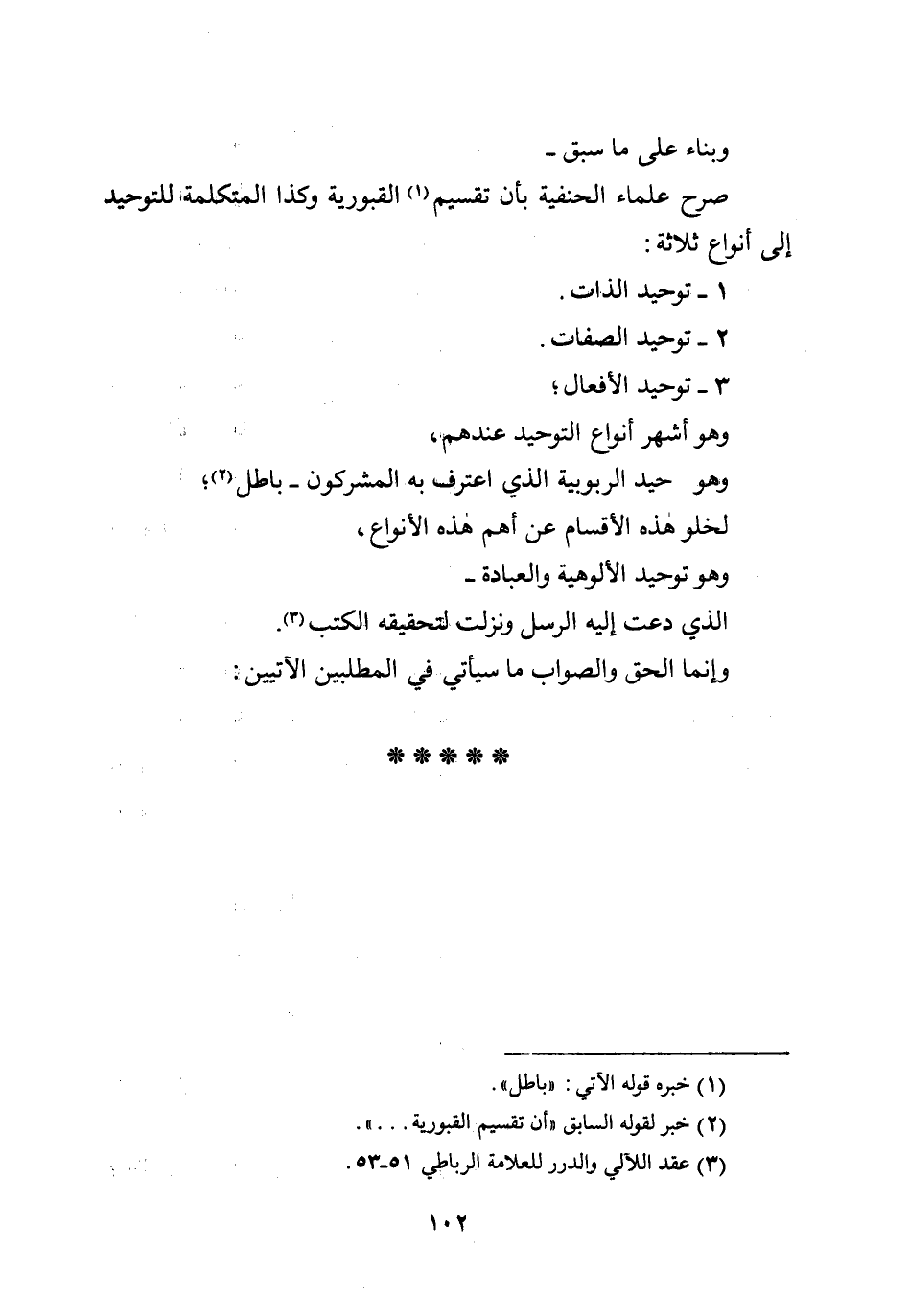وبناء على ما سبق - صرح علماء الحنفية بأن تقسيم القبورية وكذا المتكلمة للتوحيد إلى أنواع ثلاثة: