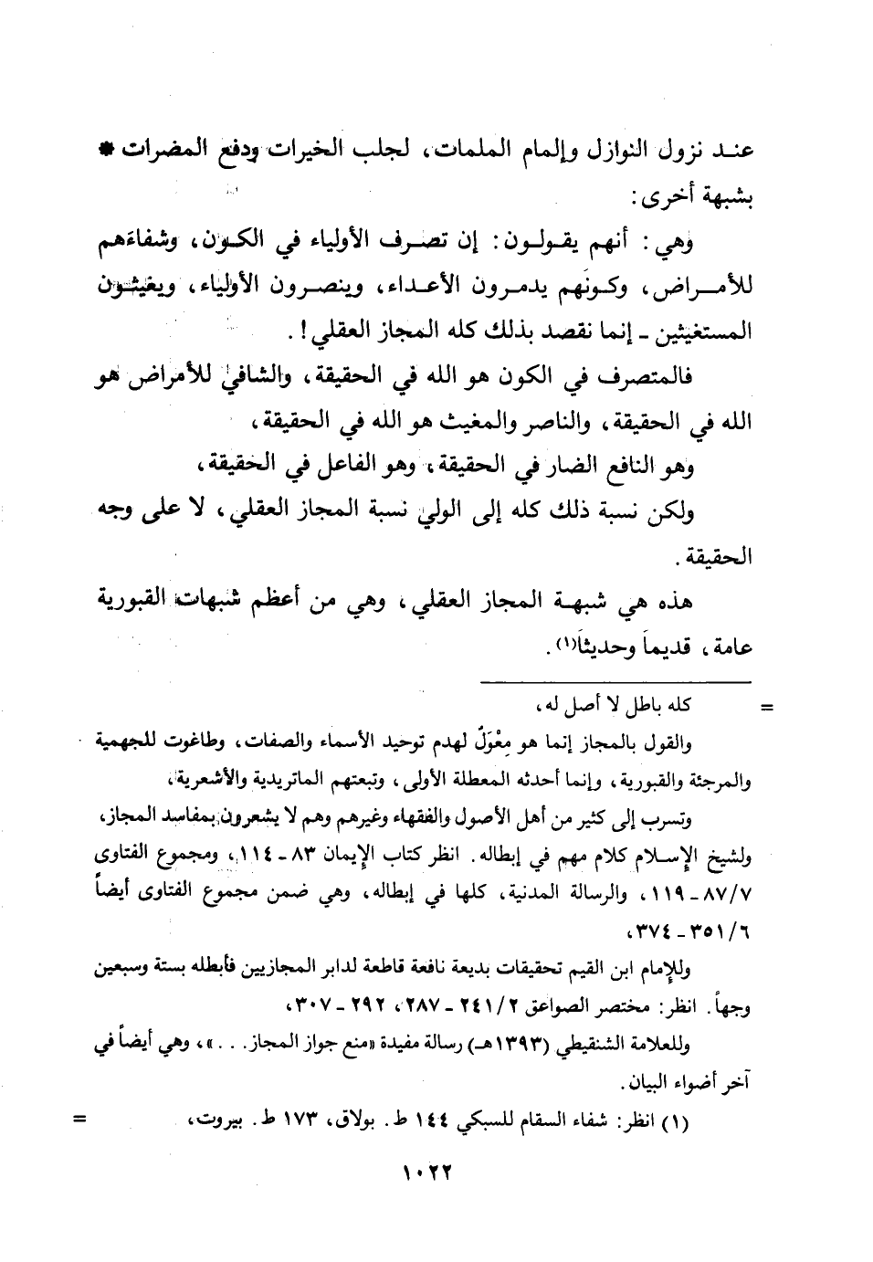 هذه هي شبهة المجاز العقلي، وهي من أعظم شبهات القبورية عامة، قديما وحديثا.