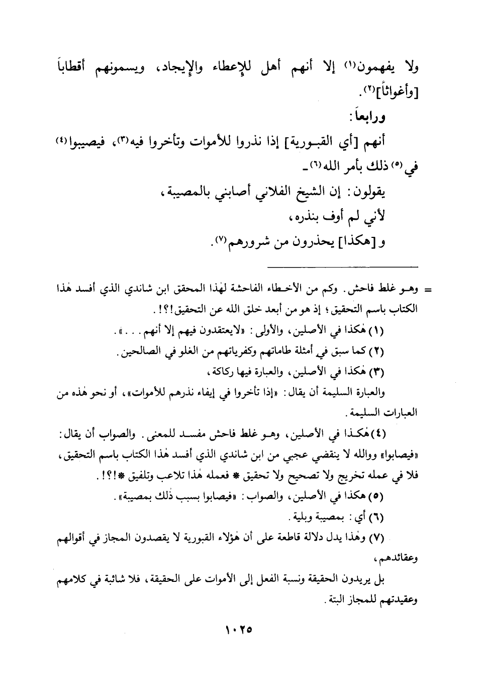 أنهم [أي القبورية] إذا نذروا للأموات وتأخروا فيه، فيصيبوا في ذلك بأمر الله.