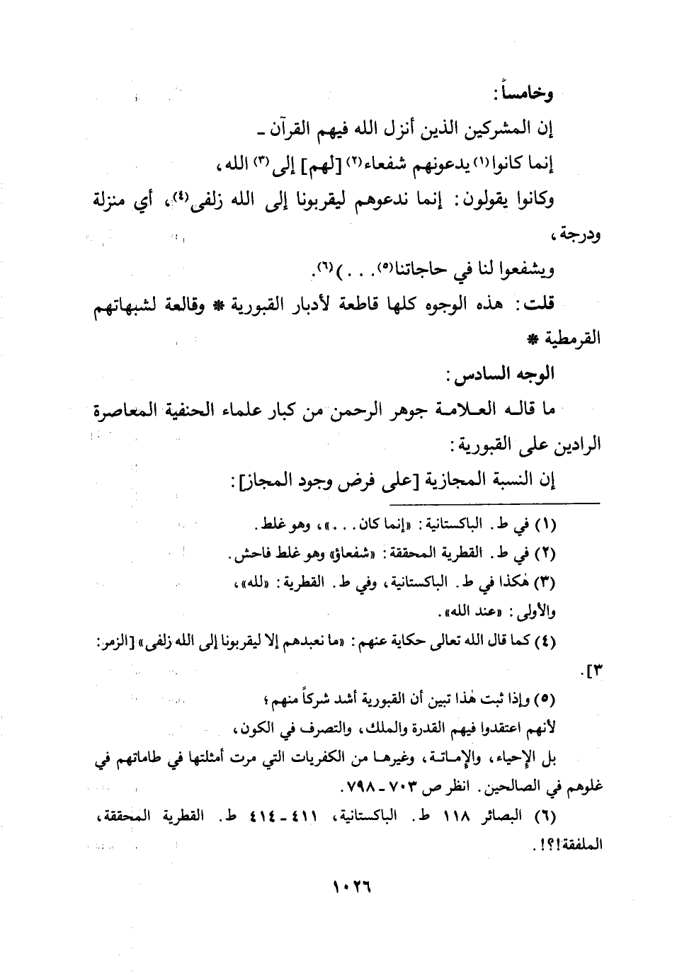 قلت: هذه الوجوه كلها قاطعة لأدبار القبورية * وقالعة لشبهاتهم القرمطية*