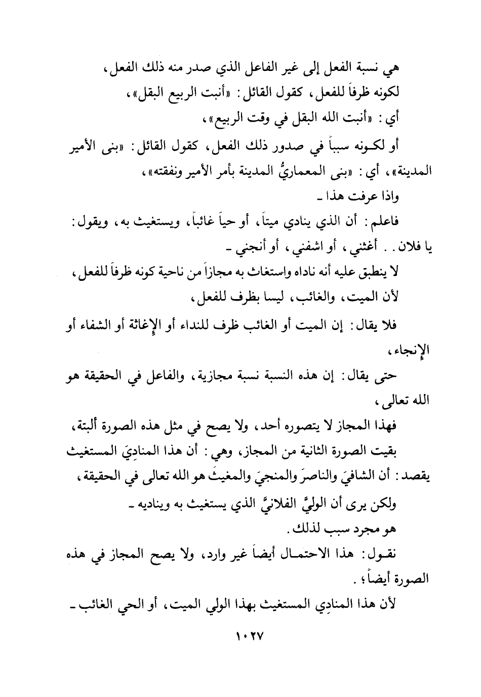 هي نسبة الفعل إلى غير الفاعل الذي صدر منه ذلك الفعل، لكونه ظرفا للفعل، كقول القائل: " أنبت الربيع البقل "، أي: " أنبت الله البقل في وقت الربيع "، أو لكونه سببا في صدور ذلك الفعل، كقول القائل: " بنى الأمير المدينة "، أي: " بنى المعماريُ المدينة بأمر الأمير ونفقته "، وإذا عرفت هذا- فاعلم: أن الذي ينادي ميتا، أو حيا غائبا، ويستغيث به، ويقول: يا فلان.. أغثني، أو اشفني، أو أنجني- لا ينطبق عليه أنه ناداه واستغاث به مجازا من ناحية كونه ظرفا للفعل، لأن الميت، والغائب، ليسا بظرف للفعل، فلا يقال: إن الميت أو الغائب ظرف للنداء أو الإغاثة أو الشفاء أو الإنجاء، حتى يقال: إن هذه النسبة نسبة مجازية، والفاعل في الحقيقة هو الله تعالى، فهذا المجاز لا يتصوره أحد، ولا يصح في مثل هذه الصورة ألبتة، بقيت الصورة الثانية من المجاز، وهي: أن هذا المنادِيَ المستغيث يقصد: أن الشافيَ والناصرَ والمنجيَ والمغيثَ هو الله تعالى في الحقيقة، ولكن يرى أن الوليَّ الفلانيَّ الذي يستغيث به ويناديه- هو مجرد سبب لذلك.