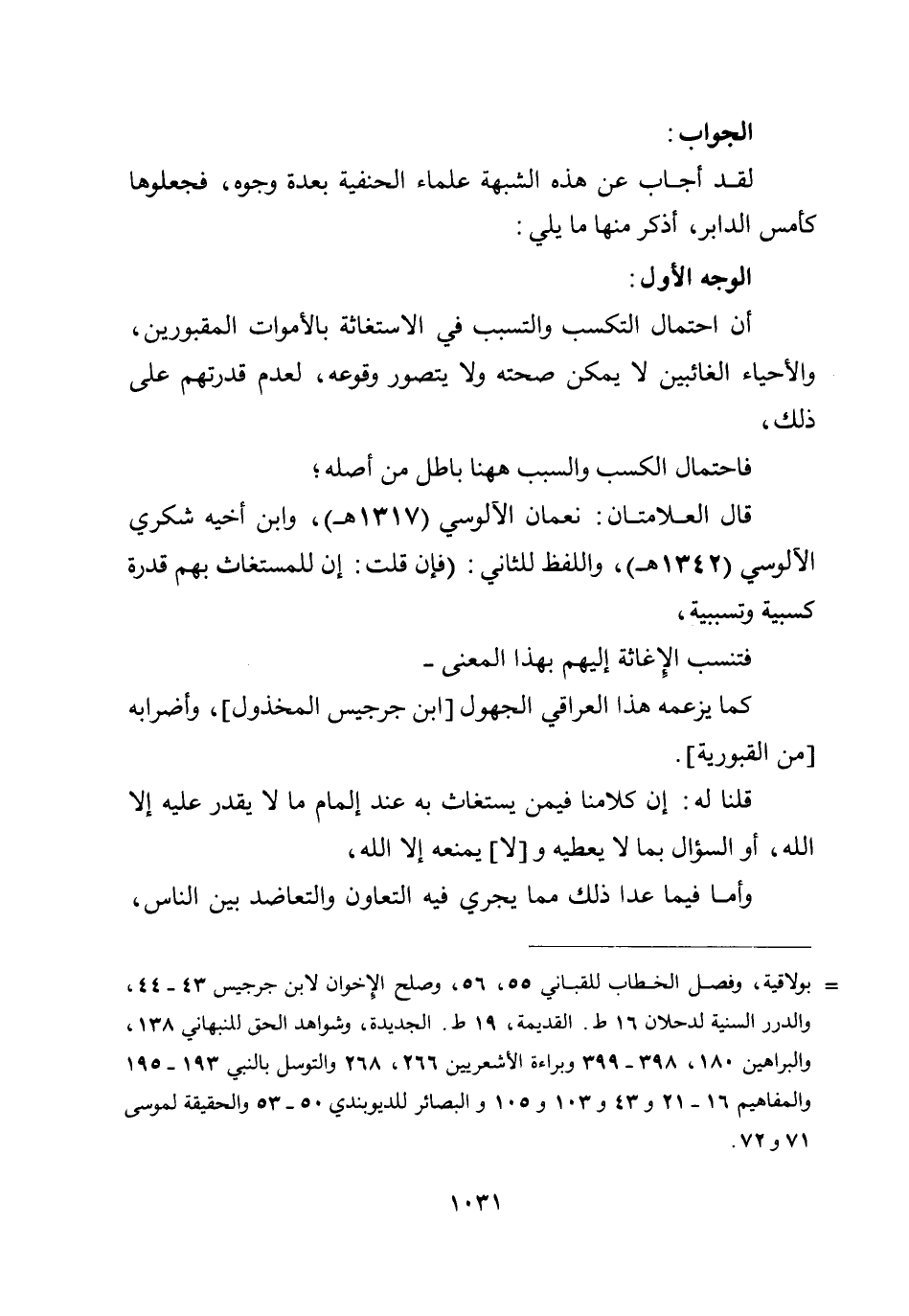 أن احتمال التكسب والتسبب في الاستغاثة بالأموات المقبورين، والأحياء الغائبين لا يمكن صحته ولا يتصور وقوعه، لعدم قدرتهم على ذلك، فاحتمال الكسب والسبب ههنا باطل من أصله؛ قال العلامتان: نعمان الآلوسي (1317هـ) ، وابن أخيه شكري الآلوسي (1342هـ) ، واللفظ للثاني: (فإن قلت: إن للمستغاث بهم قدرة كسبية وتسببية، فتنسب الإغاثة إليهم بهذا المعنى- كما يزعمه هذا العراقي الجهول [ابن جرجيس المخذول] ، وأضرابه [من القبورية] .