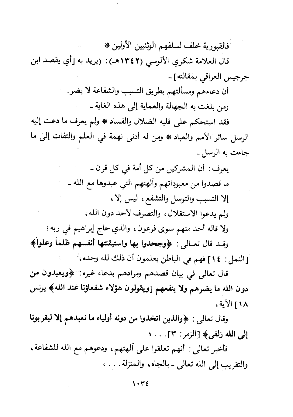 فالقبورية خلف لسلفهم الوثنيين الأولين* قال العلامة شكري الآلوسي (1342هـ) : (يريد به [أي يقصد ابن جرجيس العراقي بمقالته]- أن دعاءهم ومسألتهم بطريق التسبب والشفاعة لا يضر.