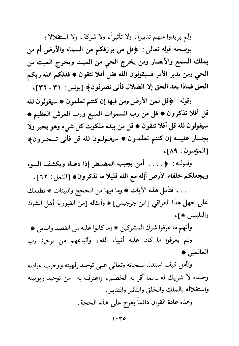 ولم يريدوا منهم تدبيرا، ولا تأثيرا، ولا شركة، ولا استقلالا؛ يوضحه قوله تعالى: {قُلْ مَنْ يَرْزُقُكُمْ مِنَ السَّمَاءِ وَالْأَرْضِ أَمَّنْ يَمْلِكُ السَّمْعَ وَالْأَبْصَارَ وَمَنْ يُخْرِجُ الْحَيَّ مِنَ الْمَيِّتِ وَيُخْرِجُ الْمَيِّتَ مِنَ الْحَيِّ وَمَنْ يُدَبِّرُ الْأَمْرَ فَسَيَقُولُونَ اللَّهُ فَقُلْ أَفَلَا تَتَّقُونَ فَذَلِكُمُ اللَّهُ رَبُّكُمُ الْحَقُّ فَمَاذَا بَعْدَ الْحَقِّ إِلَّا الضَّلَالُ فَأَنَّى تُصْرَفُونَ} [يونس: 31-32] ، وقوله: {قُلْ لِمَنِ الْأَرْضُ وَمَنْ فِيهَا إِنْ كُنْتُمْ تَعْلَمُونَ سَيَقُولُونَ لِلَّهِ قُلْ أَفَلَا تَذَكَّرُونَ قُلْ مَنْ رَبُّ السَّمَاوَاتِ السَّبْعِ وَرَبُّ الْعَرْشِ الْعَظِيمِ سَيَقُولُونَ لِلَّهِ قُلْ أَفَلَا تَتَّقُونَ قُلْ مَنْ بِيَدِهِ مَلَكُوتُ كُلِّ شَيْءٍ وَهُوَ يُجِيرُ وَلَا يُجَارُ عَلَيْهِ إِنْ كُنْتُمْ تَعْلَمُونَ سَيَقُولُونَ لِلَّهِ قُلْ فَأَنَّى تُسْحَرُونَ} [المؤمنون: 89] ، وقوله: ... {أَمَّنْ يُجِيبُ الْمُضْطَرَّ إِذَا دَعَاهُ وَيَكْشِفُ السُّوءَ وَيَجْعَلُكُمْ خُلَفَاءَ الْأَرْضِ أَإِلَهٌ مَعَ اللَّهِ قَلِيلًا مَا تَذَكَّرُونَ} [النمل: 62] ، ... ، فتأمل هذه الآيات* وما فيها من الحجج والبينات * تطلعك على جهل هذا العراقي [ابن جرجيس] * وأمثاله [من القبورية أهل الشرك والتلبيس *] ، وأنهم ما عرفوا شرك المشركين * وما كانوا عليه من القصد والدين* ولم يعرفوا ما كان عليه أنبياء الله، وأتباعهم من توحيد رب العالمين* وتأمل كيف استدل سبحانه وتعالى على توحيد إلهيته ووجوب عبادته وحده لا شريك له- بما أقر به الخصم، واعترف به: من توحيد ربوبيته واستقلاله بالملك والخلق والتأثير والتدبير، وهذه عادة القرآن دائما يعرج على هذه الحجة،