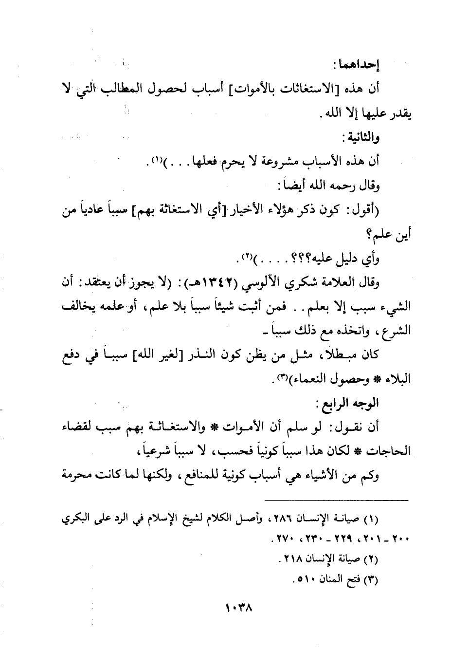 أن نقول: لو سلم أن الأموات* والاستغاثة بهم سبب لقضاء الحاجات* لكان هذا سببا كونيا فحسب، لا سببا شرعيا، وكم من الأشياء هي أسباب كونية للمنافع، ولكنها لما كانت محرمة