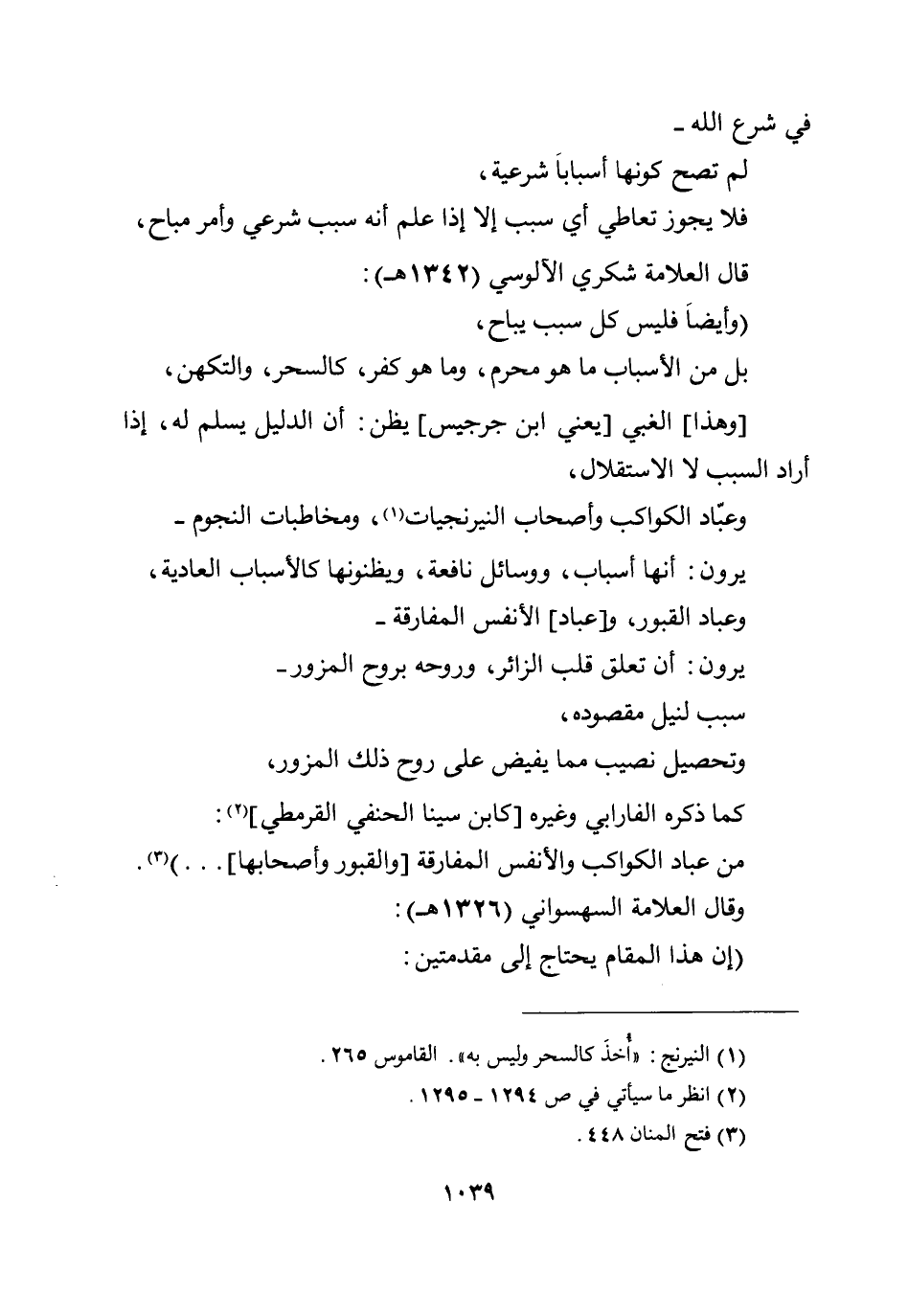 (وأيضا فليس كل سبب يباح، بل من الأسباب ما هو محرم، وما هو كفر، كالسحر، والتكهن، [وهذا] الغبي [يعني ابن جرجيس] يظن: أن الدليل يسلم له، إذا أراد السبب لا الاستقلال، وعبّاد الكواكب وأصحاب النيرنجيات، ومخاطبات النجوم- يرون: أنها أسباب، ووسائل نافعة، ويظنونها كالأسباب العادية، وعباد القبور، و [عباد] الأنفس المفارقة- يرون: أن تعلق قلب الزائر، وروحه بروح المزور- سبب لنيل مقصوده، وتحصيل نصيب مما يفيض على روح ذلك المزور، كما ذكره الفارابي وغيره [كابن سينا الحنفي القرمطي] :