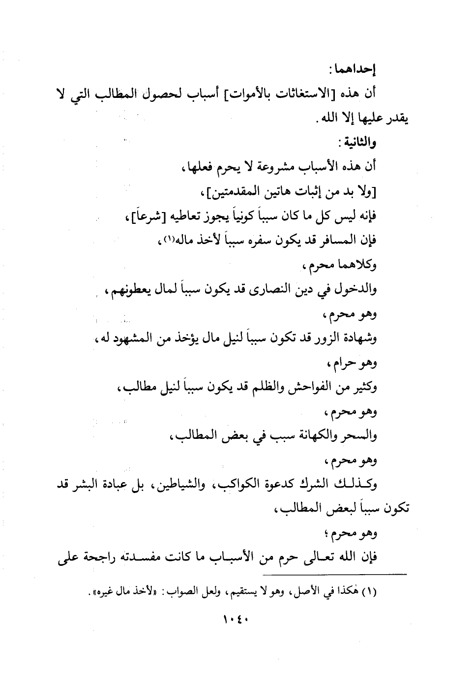 أن هذه الأسباب مشروعة لا يحرم فعلها، [ولا بد من إثبات هاتين المقدمتين] ، فإنه ليس كل ما كان سببا كونيا يجوز تعاطيه [شرعا] ، فإن المسافر قد يكون سفره سببا لأخذ ماله، وكلاهما محرم، والدخول في دين النصارى قد يكون سببا لمال يعطونهم، وهو محرم، وشهادة الزور قد تكون سببا لنيل مال يؤخذ من المشهود له، وهو حرام، وكثير من الفواحش والظلم قد يكون سببا لنيل مطالب، وهو محرم، والسحر والكهانة سبب في بعض المطالب، وهو محرم، وكذلك الشرك كدعوة الكواكب، والشياطين، بل عبادة البشر قد تكون سببا لبعض المطالب، وهو محرم؛ فإن الله تعالى حرم من الأسباب ما كانت مفسدته راجحة على