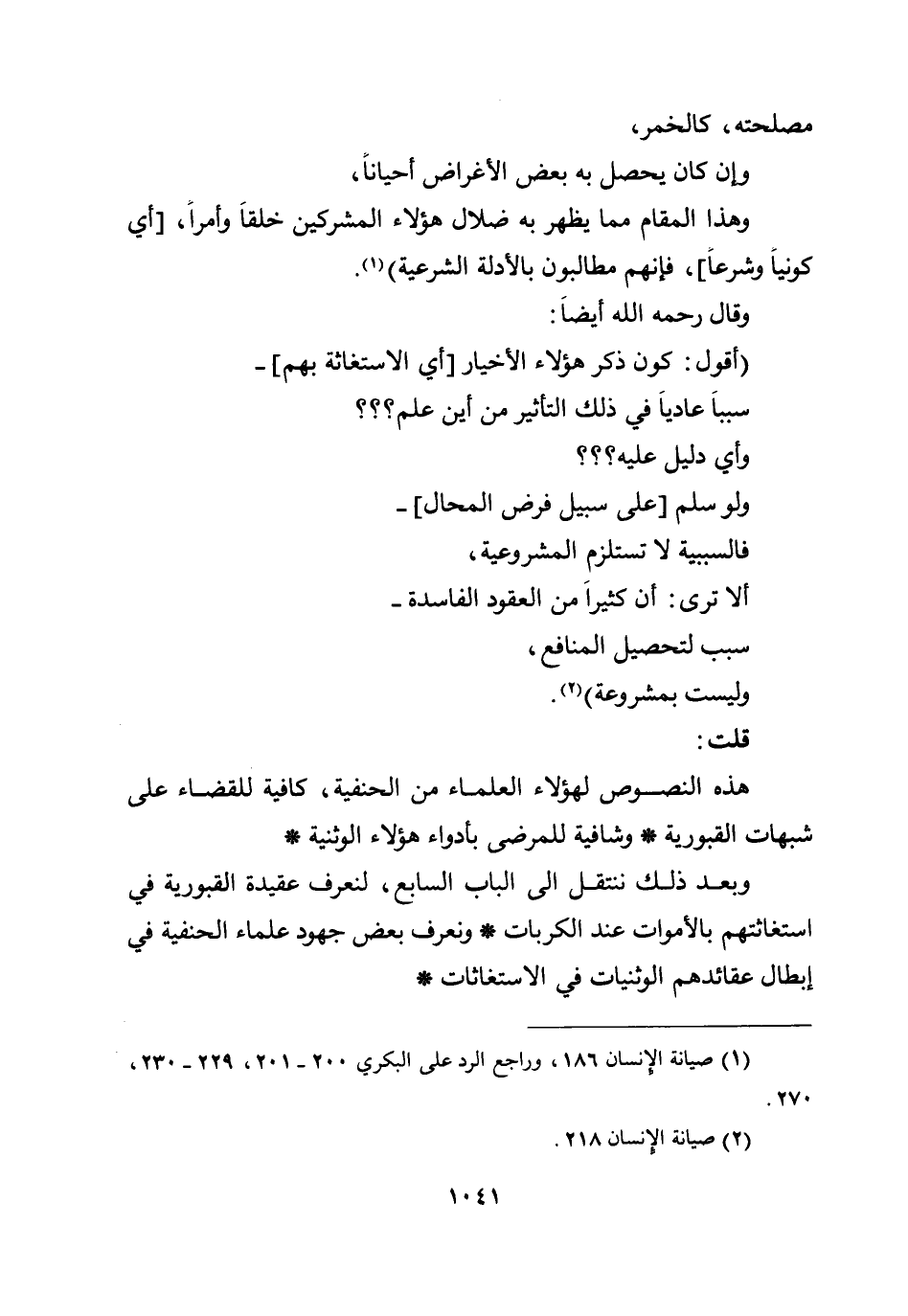 (أقول: كون ذكر هؤلاء الأخيار [أي الاستغاثة بهم]- سببا عاديا في ذلك التأثير من أين علم؟؟؟ وأي دليل عليه؟؟؟ ولو سلم [على سبيل فرض المحال]- فالسببية لا تستلزم المشروعية، ألا ترى: أن كثيرا من العقود الفاسدة- سبب لتحصيل المنافع، وليست بمشروعة) .